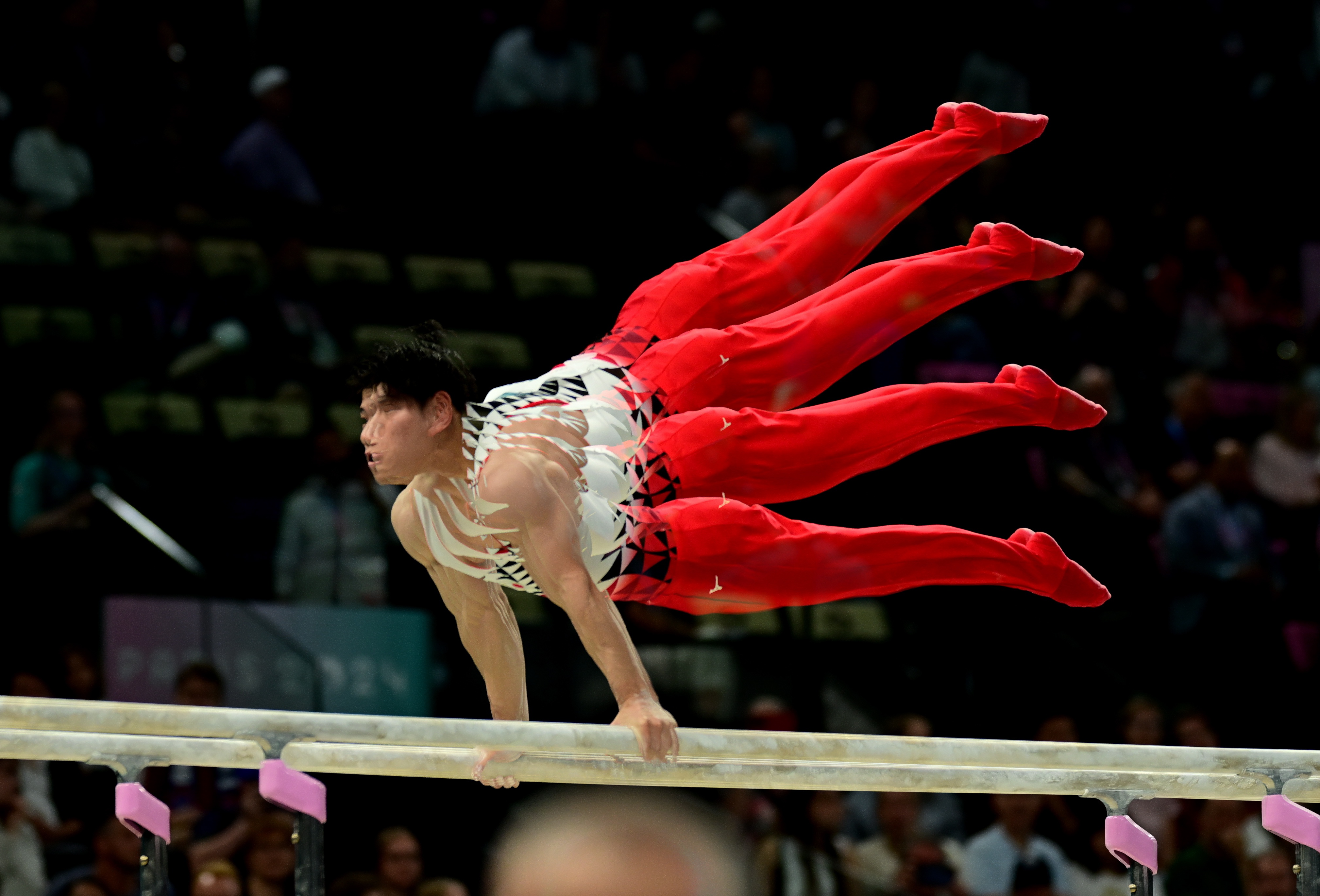 Multiple exposure of Daiki Hashimoto of Japan on the Parallel Bars during the Men Qualification of the Artistic Gymnastics competitions in the Paris 2024 Olympic Games, at the Bercy Arena in Paris, France, 27 July 2024. (Photo by Christian Bruna/EPA/EFE)