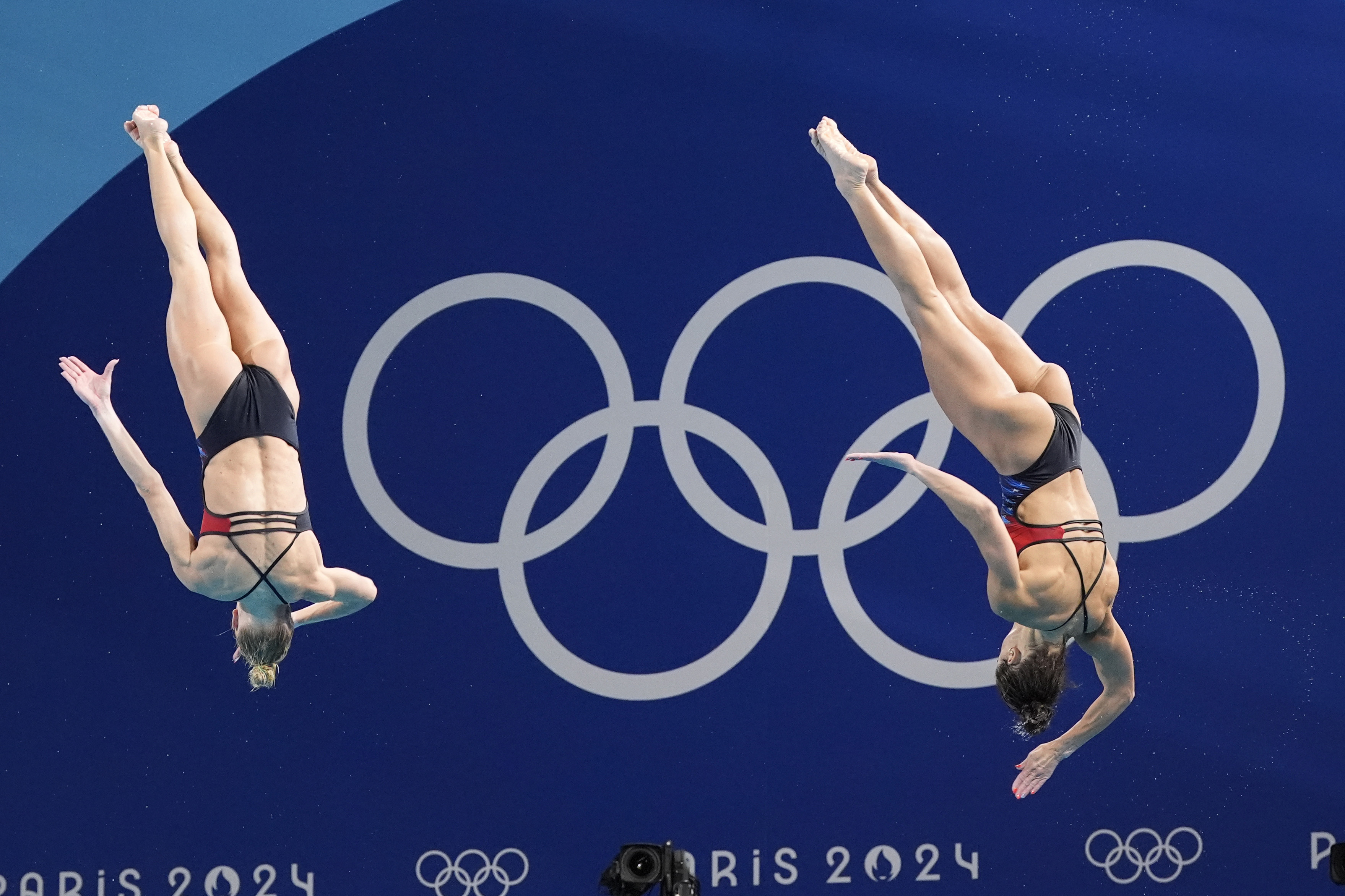 China's Chen Yiwen and Chang Yani compete in the women's synchronised 3m springboard diving final at the 2024 Summer Olympics, Saturday, July 27, 2024, in Saint-Denis, France. (Photo by Lee Jin-man/AP Photo)