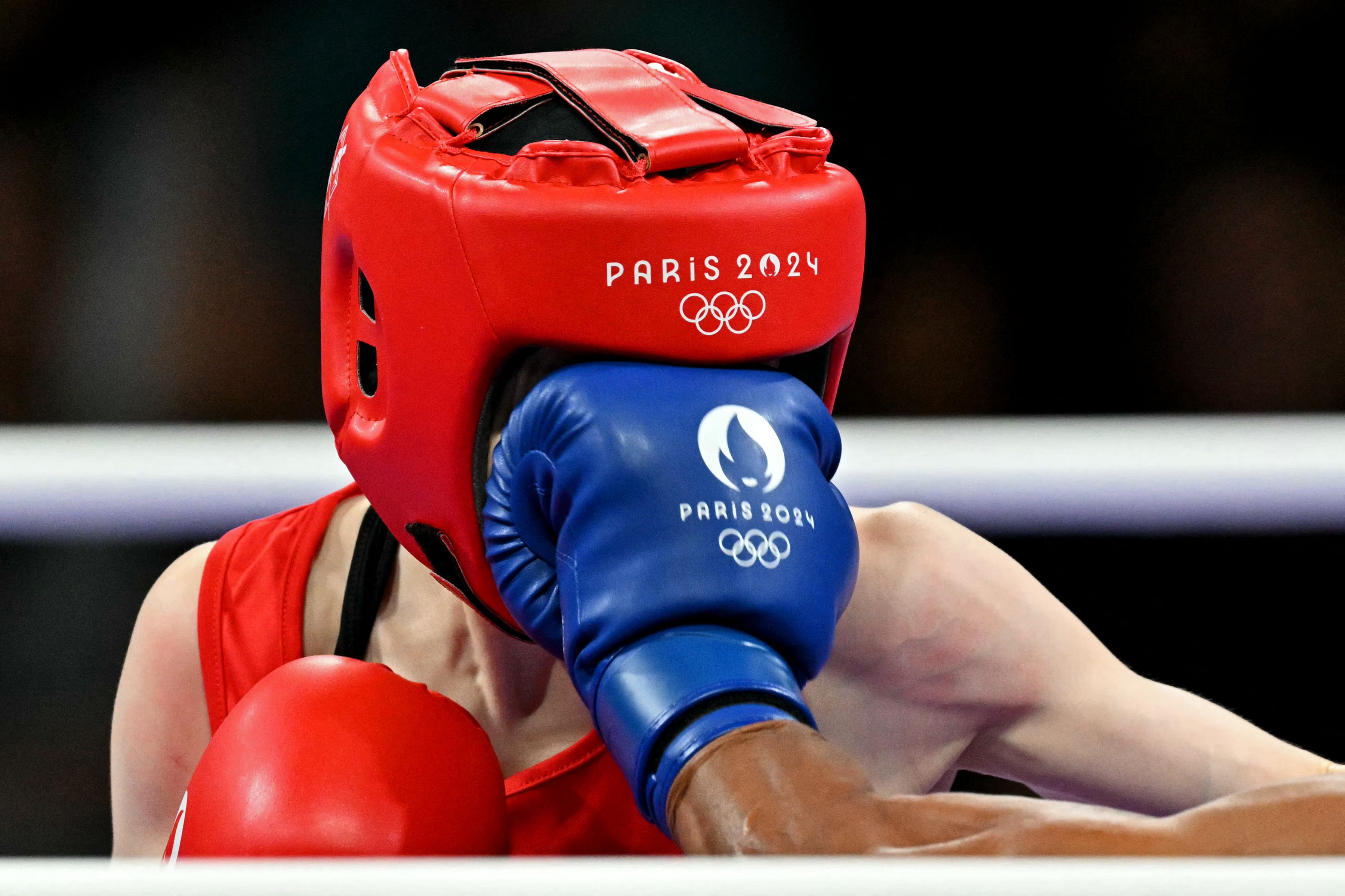 Mongolia's Yesugen Oyuntsetseg is punched by Colombia's Ingrit Lorena Valencia Victoria in the women's 50kg preliminaries round of 32 boxing match during the Paris 2024 Olympic Games at the North Paris Arena, in Villepinte on July 28, 2024. (Photo by Mohd Rasfan/AFP Photo)