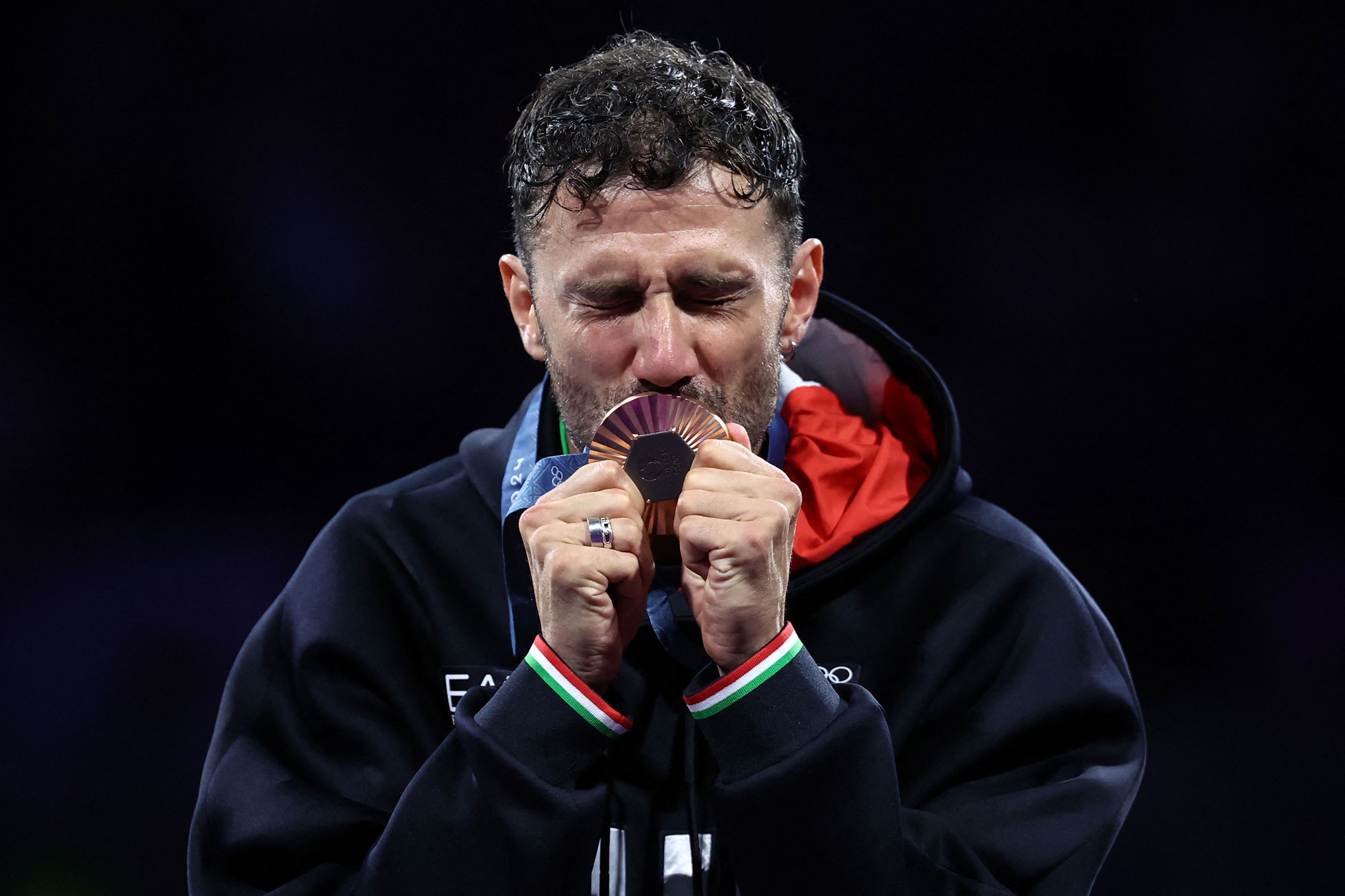 Bronze medallist Luigi Samele of Italy celebrates on the podium during the medal ceremony for the men's individual sabre competition on July 27, 2024. (Photo by Franck Fife/AFP Photo)