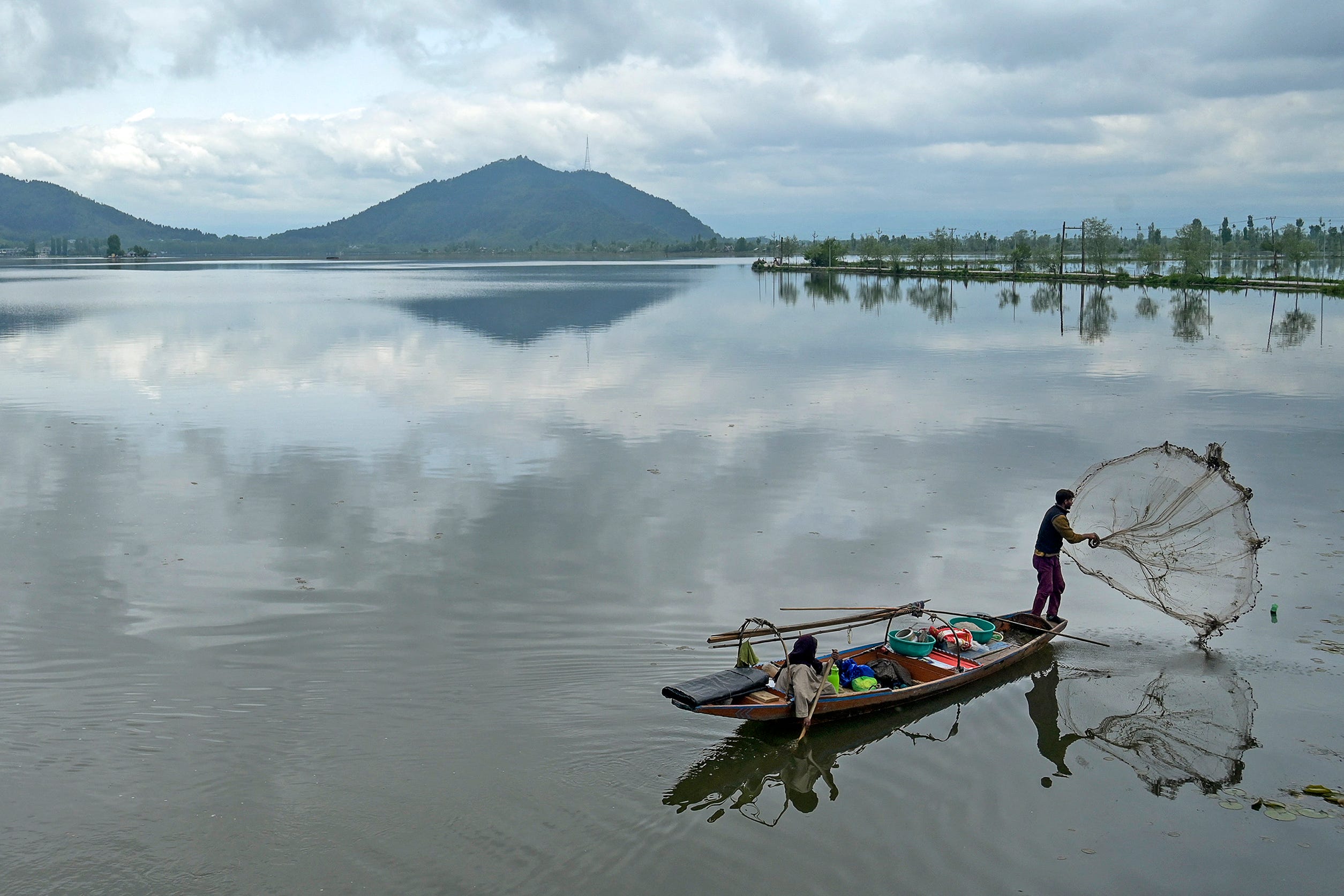 A fisherman casts his net from a boat at Dal Lake after water levels rose due to heavy rains, in Srinagar on April 30, 2024. (Photo by Tauseef Mustafa/AFP Photo)
