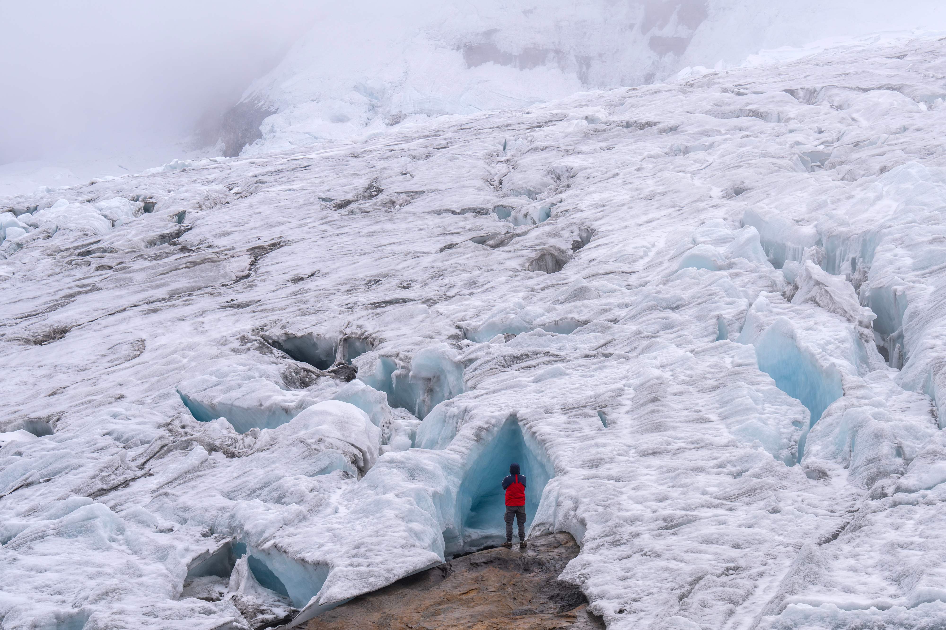A tourist explores the Ritacuba Blanco glacier at the Natural National Park Nevado El Cocuy in Boyaca Department, Colombia, on April 19, 2024. The Ritacuba Blanco glacier, one of Colombia's highest snow-capped peaks, should be covered by a blanket of homogeneous snow. But a brutal El Niño phenomenon melted it and exposed gigantic crevasses, a sign of its agony. (Photo by Luis Acosta/AFP Photo)