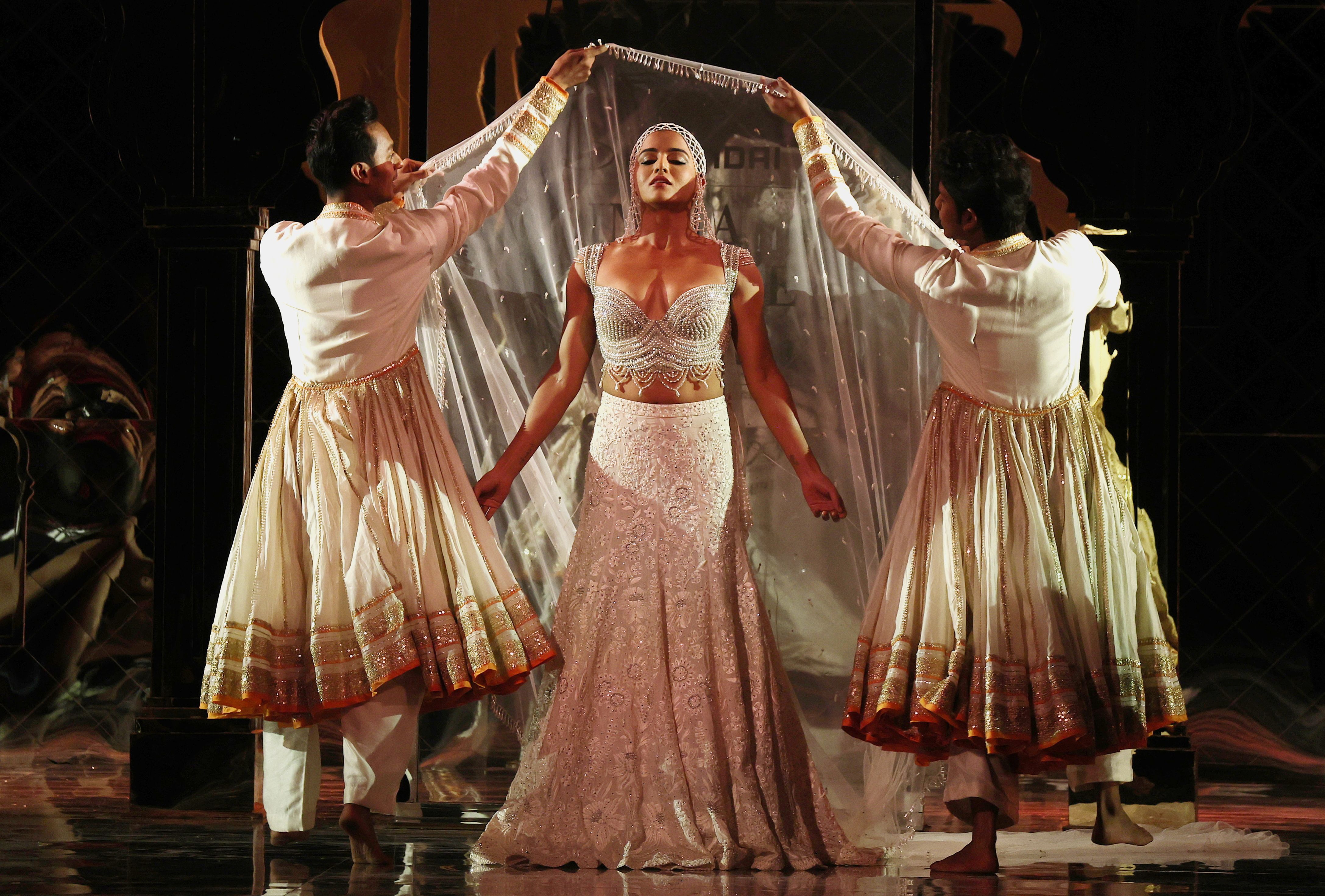 A model presents a creation by designers Abu Jani and Sandeep Khosla during the FDCI India Couture Week 2024 in New Delhi, India, 24 July 2024. The fashion event runs from 24 to 31 July 2024. (Photo by Rajat Gupta/EPA)