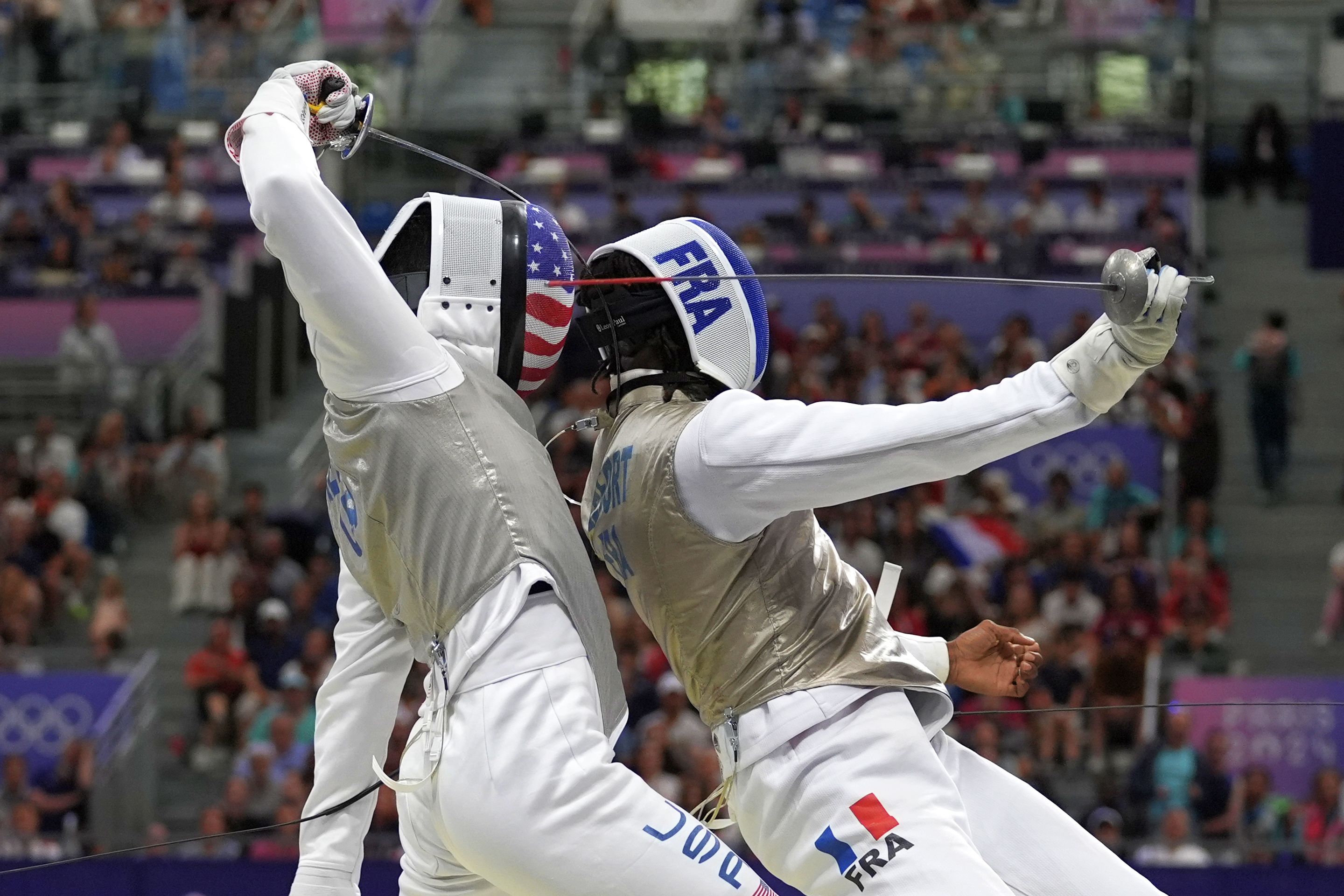 United State's Gerek Meinhardt, left, and France's Enzo Lefort compete in the men's individual Foil round of 16 competition during the 2024 Summer Olympics at the Grand Palais, Monday, July 29, 2024, in Paris, France. (Photo by Andrew Medichini/AP Photo)