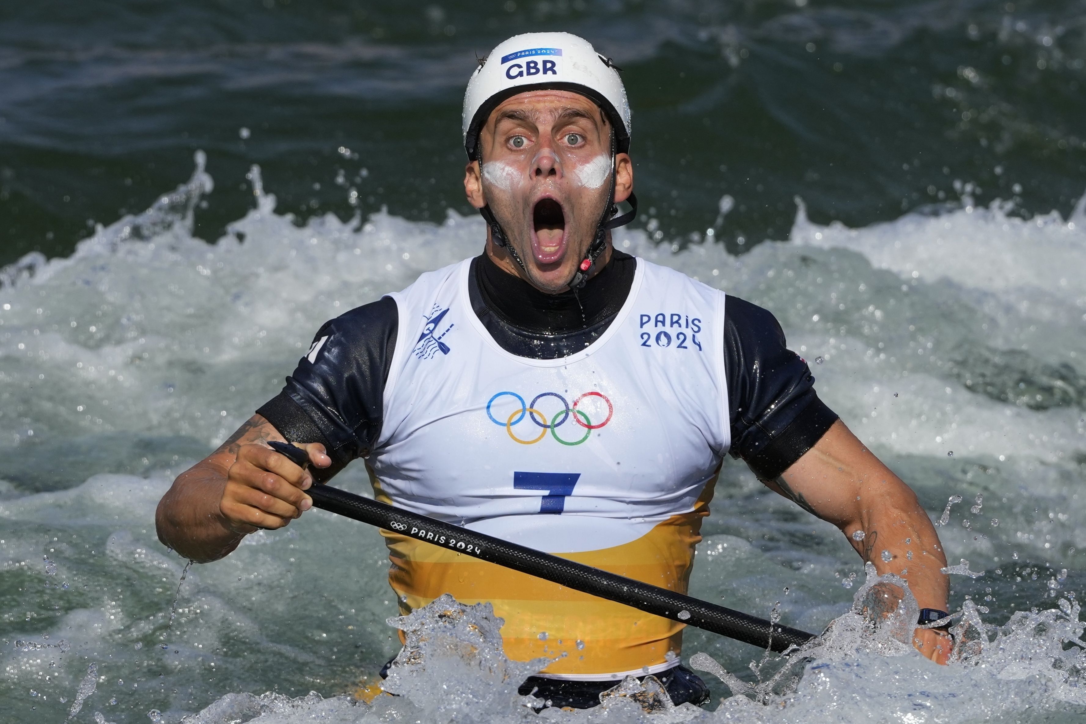 Adam Burgess of Britain reacts at the finish line of the men's canoe single finals during the canoe slalom at the 2024 Summer Olympics, Monday, July 29, 2024, in Vaires-sur-Marne, France. (Photo by Kirsty Wigglesworth/AP Photo)