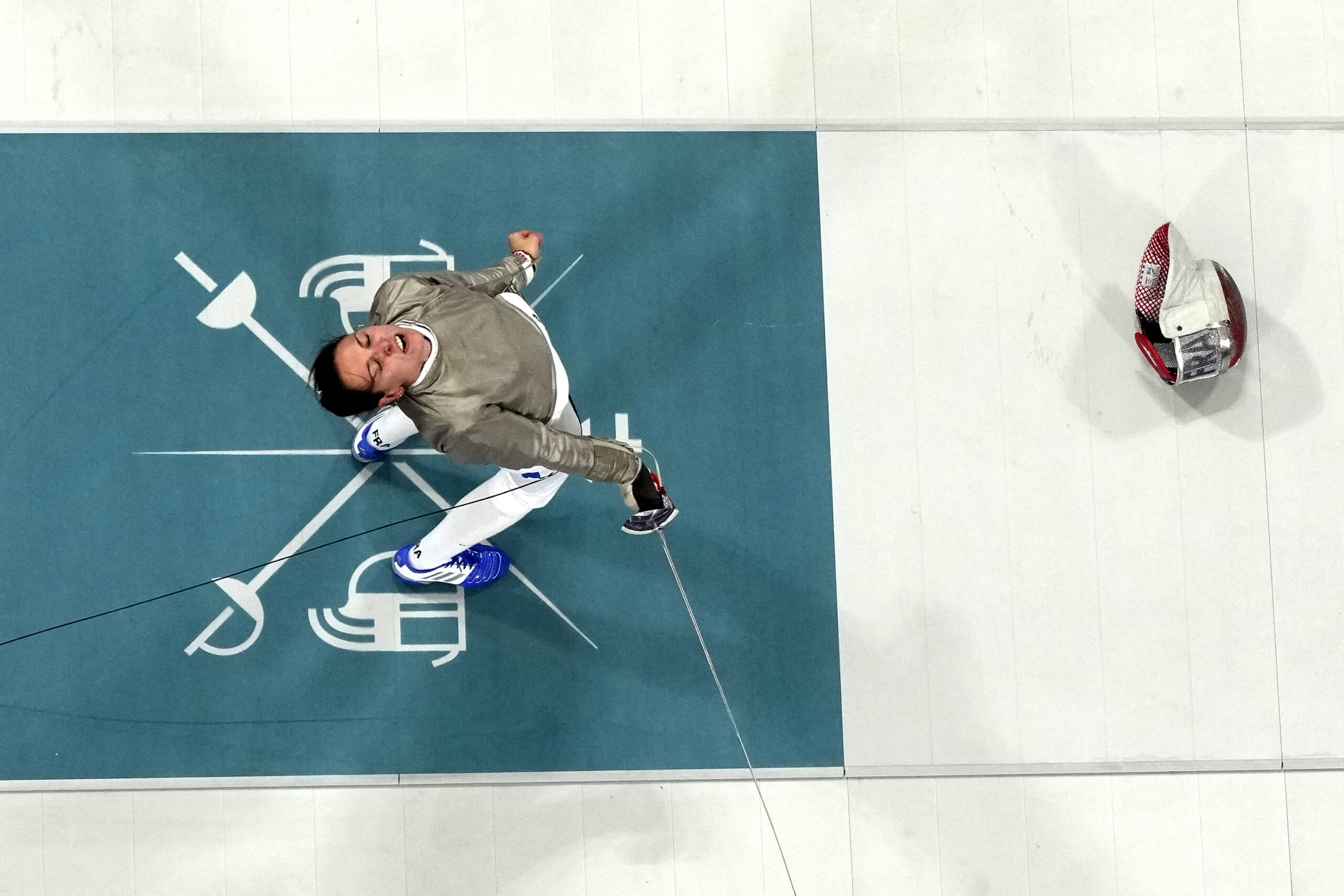 France's Manon Apithy Brunet celebrates after winning the women's individual Sabre quarterfinal match against Greece's Theodora Gkountoura at the 2024 Summer Olympics, Monday, July 29, 2024, in Paris, France. (Photo by Christophe Ena/AP Photo)