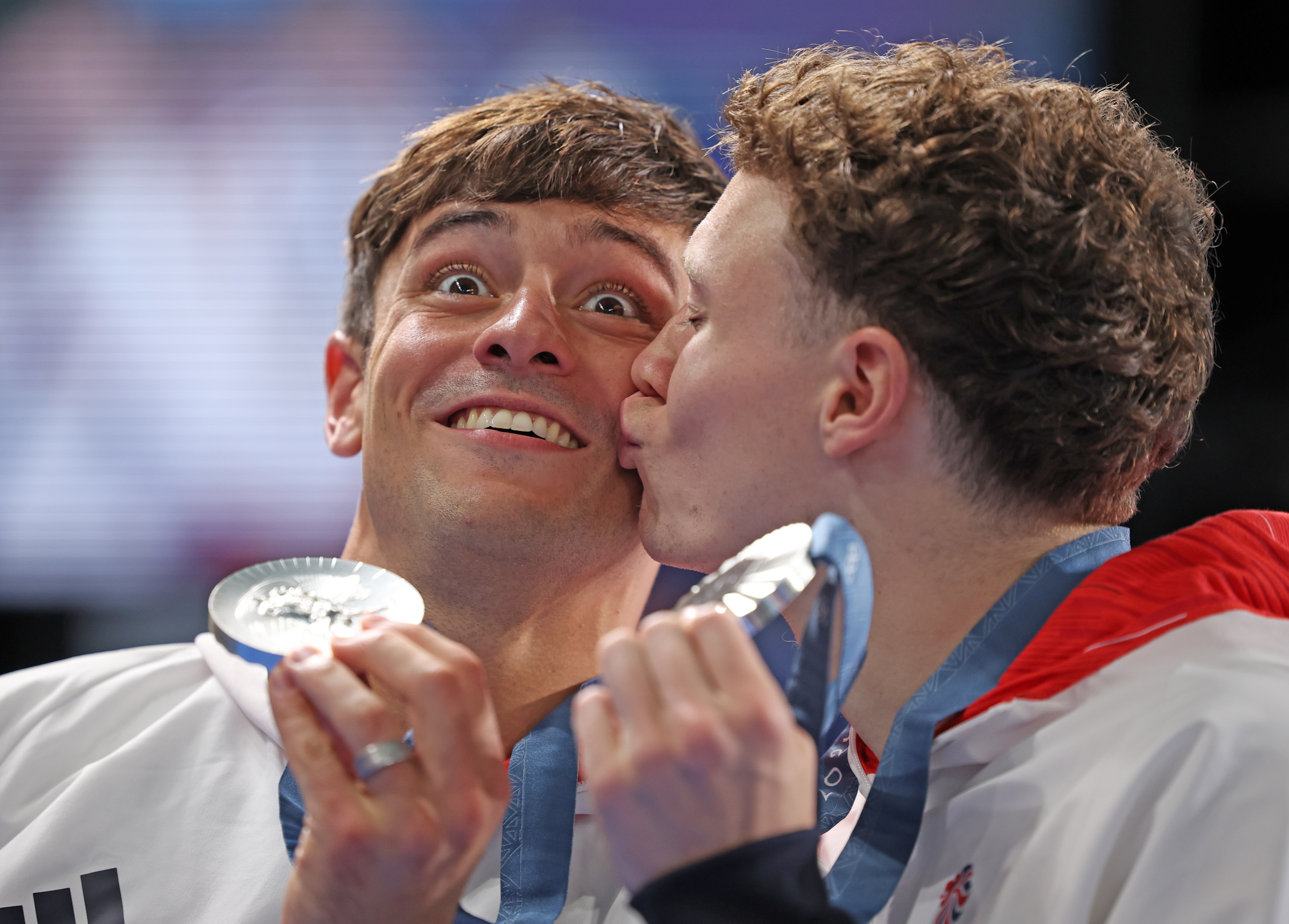 Silver Medalists Thomas Daley and Noah Williams of Team Great Britain celebrate as they pose following the Diving medal ceremony after the Men’s Synchronised 10m Platform Final on day three of the Olympic Games Paris 2024 at Aquatics Centre on July 29, 2024 in Paris, France. (Photo by Marc Aspland/The Times)