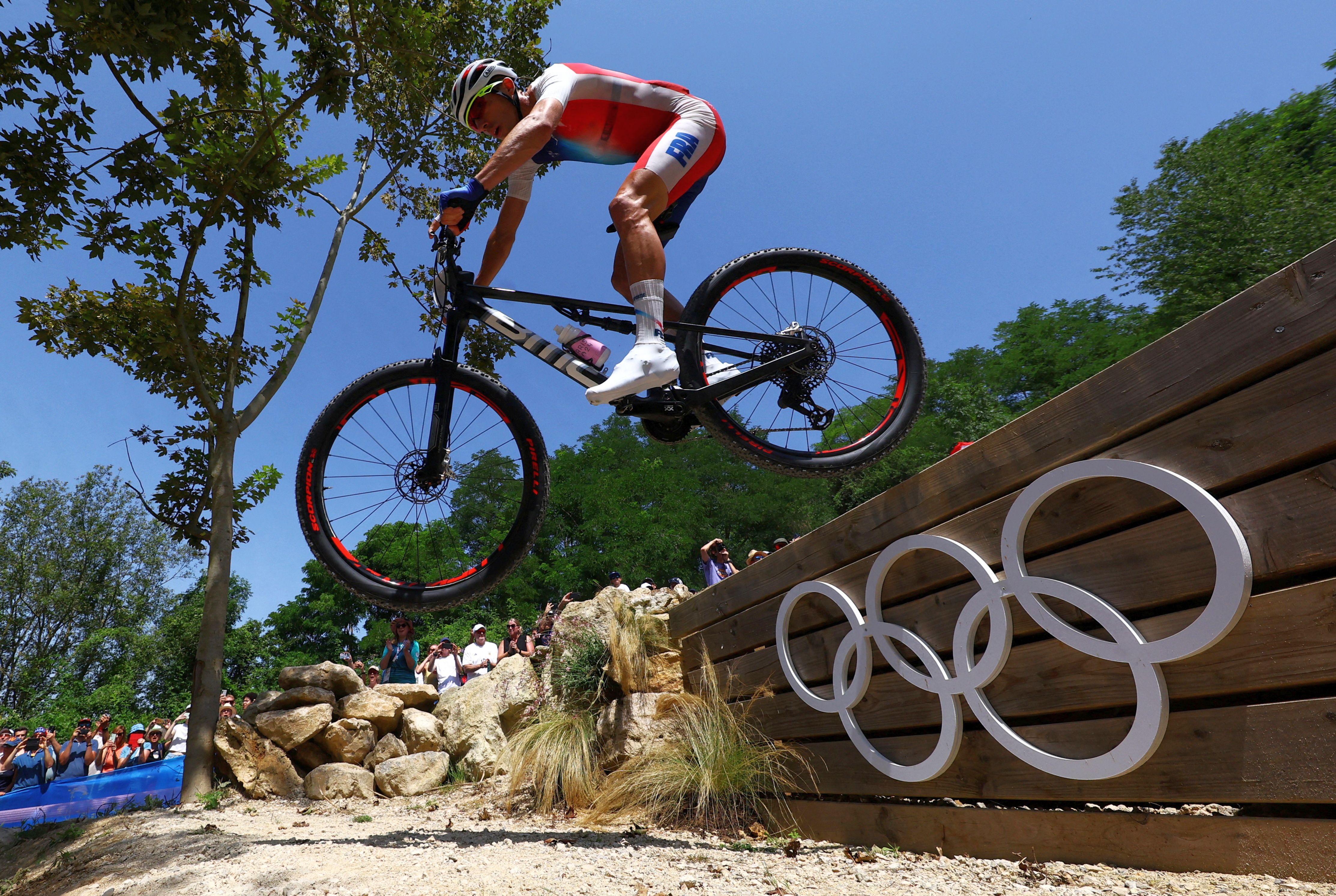Jordan Sarrou of France in the Cross-country cycling during Paris 2024 Olympic Games at Elancourt Hill on July 29, 2024 in Elancourt, France. (Photo by Matthew Childs/Reuters)