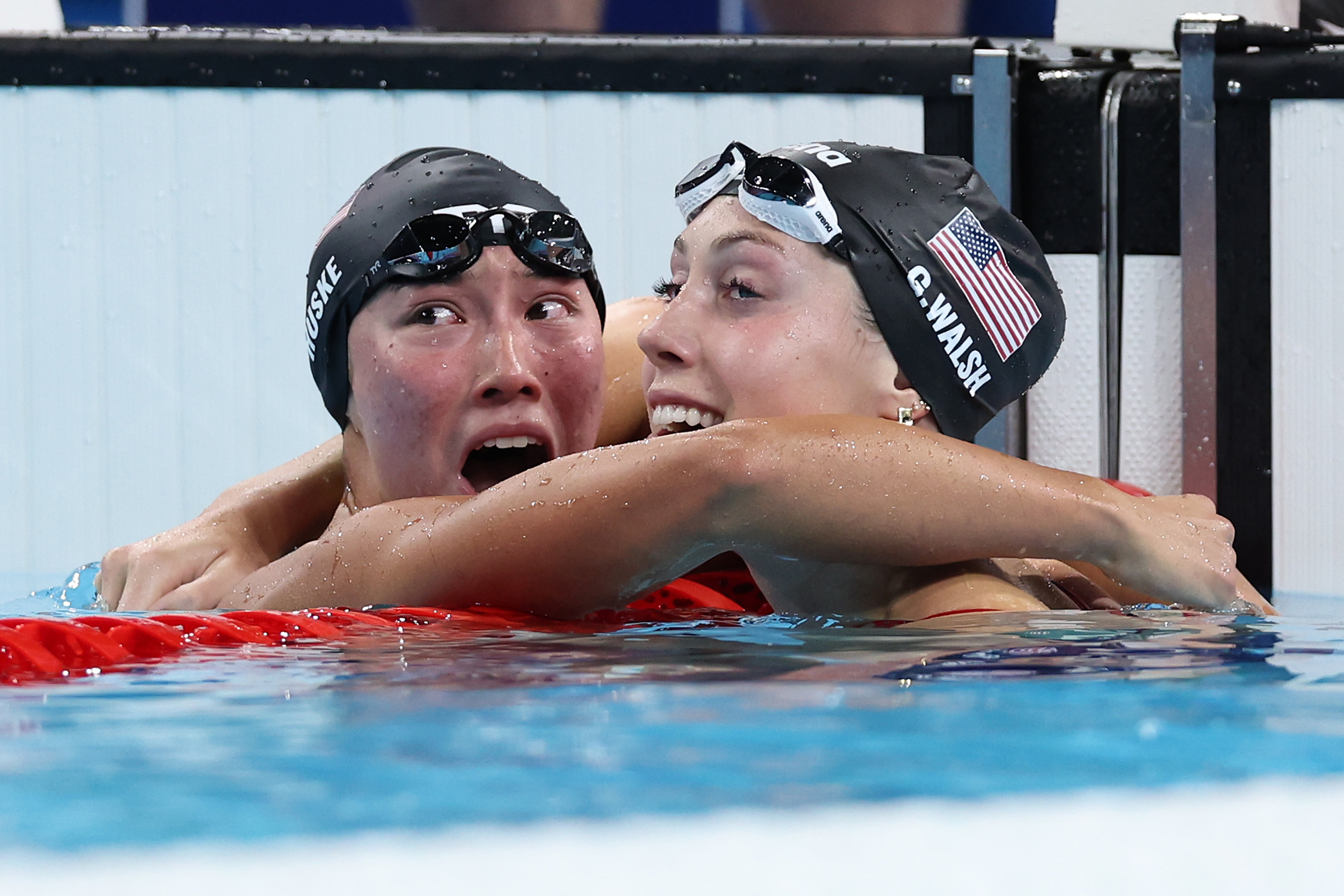 Torri Huske and Gretchen Walsh of Team United States celebrate after winning gold and silver in the Women’s 100m Butterfly Final on day two of the Olympic Games Paris 2024 at Paris La Defense Arena on July 28, 2024 in Nanterre, France. (Photo by Quinn Rooney/Getty Images)