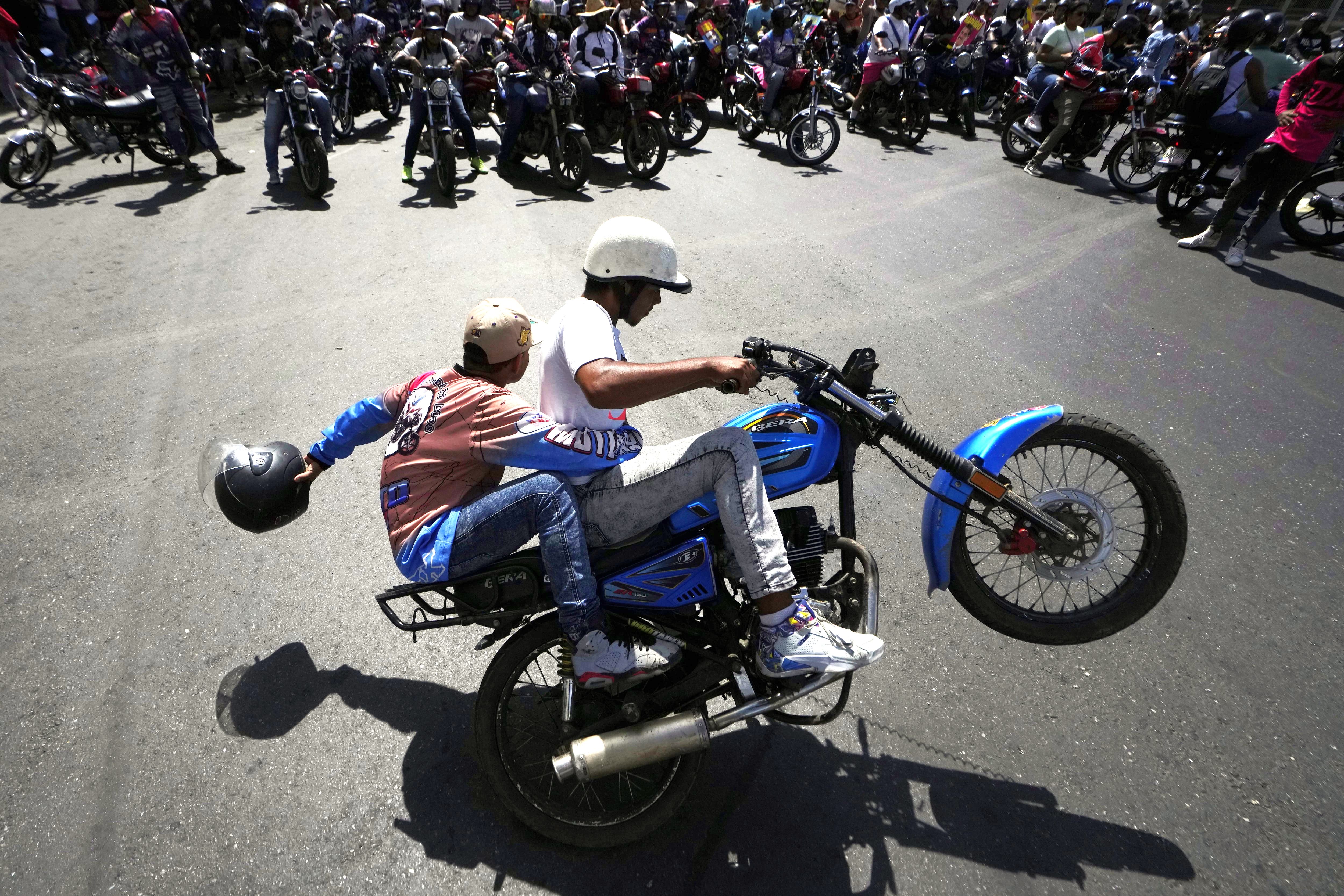 Motorcyclists do tricks as they rally before riding to the closing campaign rally of Venezuelan President Nicolas Maduro who is seeking reelection in Caracas, Venezuela, Thursday, July 25, 2024. The presidential election is set for July 28. (Photo by Matias Delacroix/AP Photo)