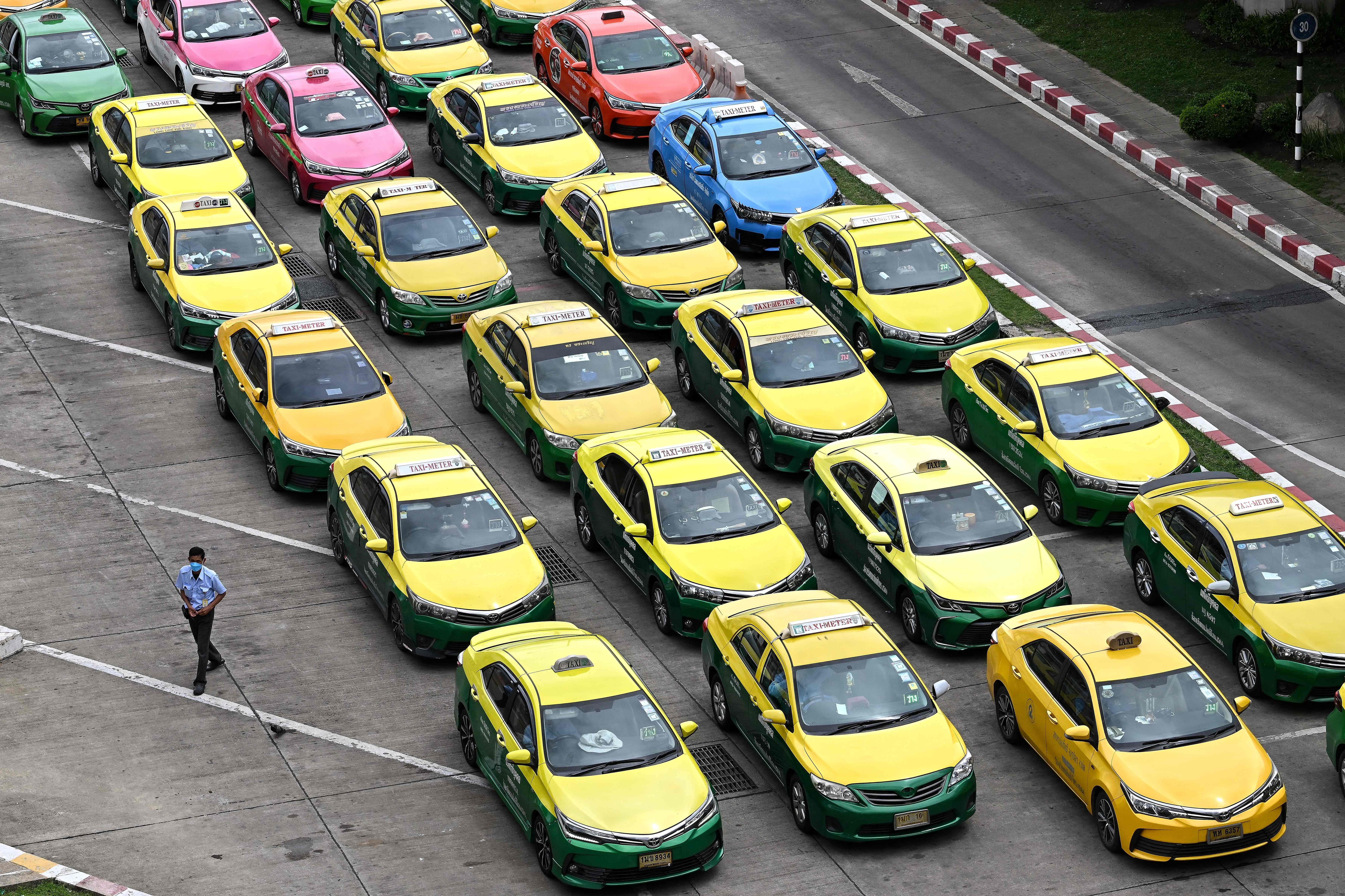 A driver (L) walks past as taxis wait in a queue at Don Mueang International Airport in Bangkok on June 25, 2024. (Photo by Manan Vatsyayana/AFP Photo)