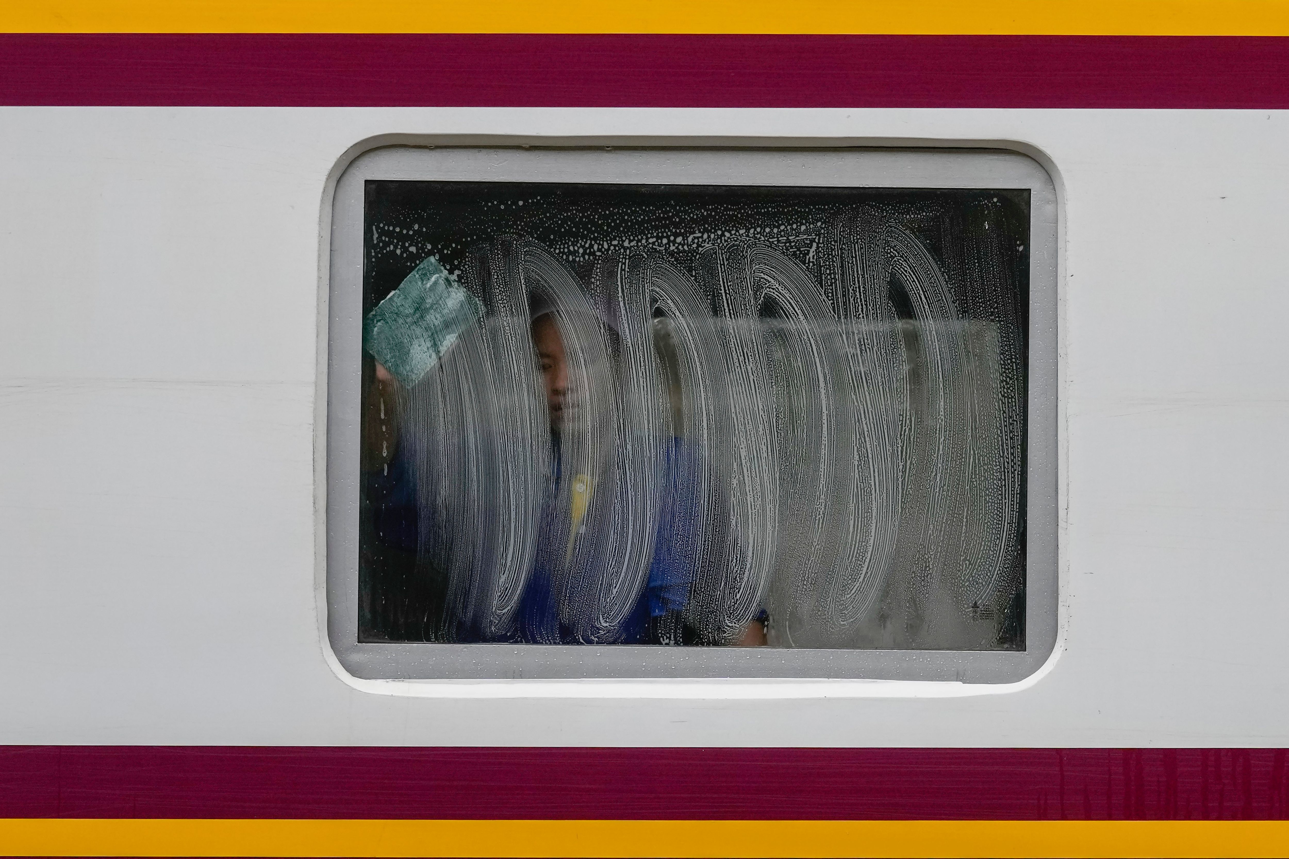 A worker cleans a window of a train at Hua Lampong Railway Station in Bangkok, Thailand, Thursday, June 27, 2024. Thailand's minimum wage is 363 baht (US$ 9.82) per day. (Photo by Sakchai Lalit/AP Photo)