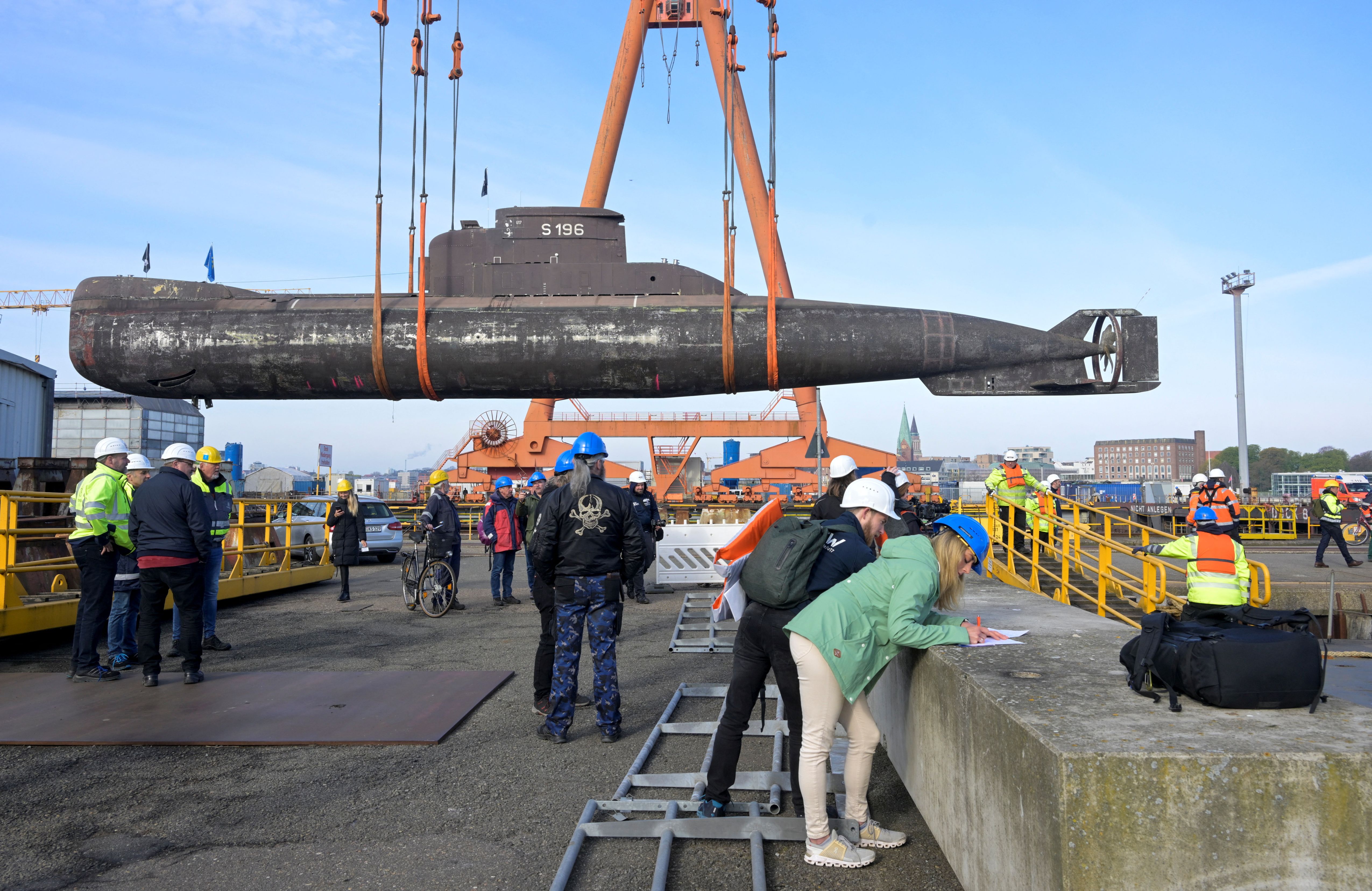 German submarine U17 is lifted by a crane to load it on a pontoon at a shipyard in Kiel, Germany on April 28, 2023. (Photo by Fabian Bimmer/Reuters)
