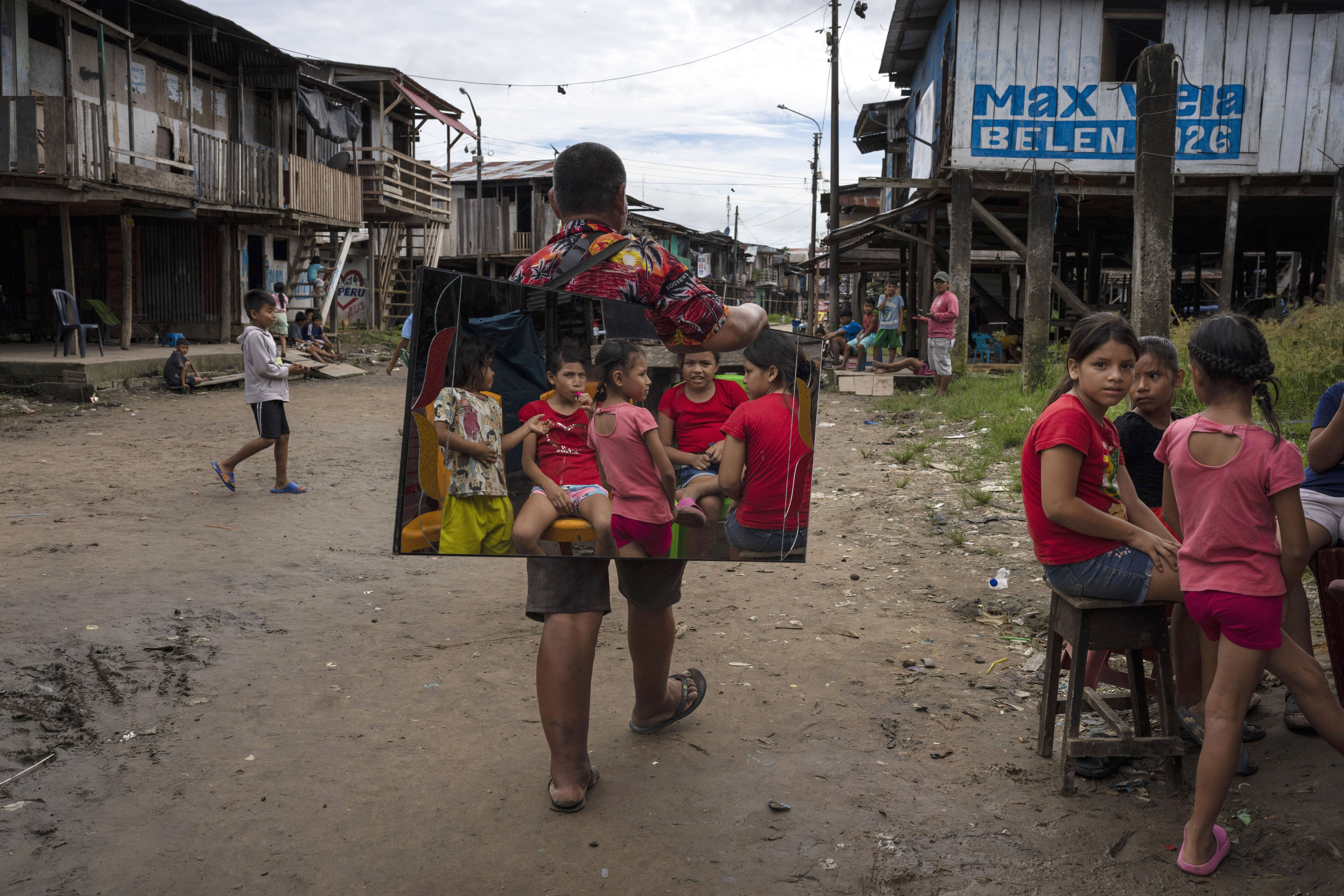 Children are reflected in vendor Manolo Apagueno's mirror as he walks by in the Belen neighborhood of Iquitos, Peru, May 25, 2024. The Indigenous community in the heart of Peru's Amazon known as the "Venice of the Jungle" is hosting the Muyuna Floating Film Festival, celebrating tropical forests. (Photo by Rodrigo Abd/AP Photo)