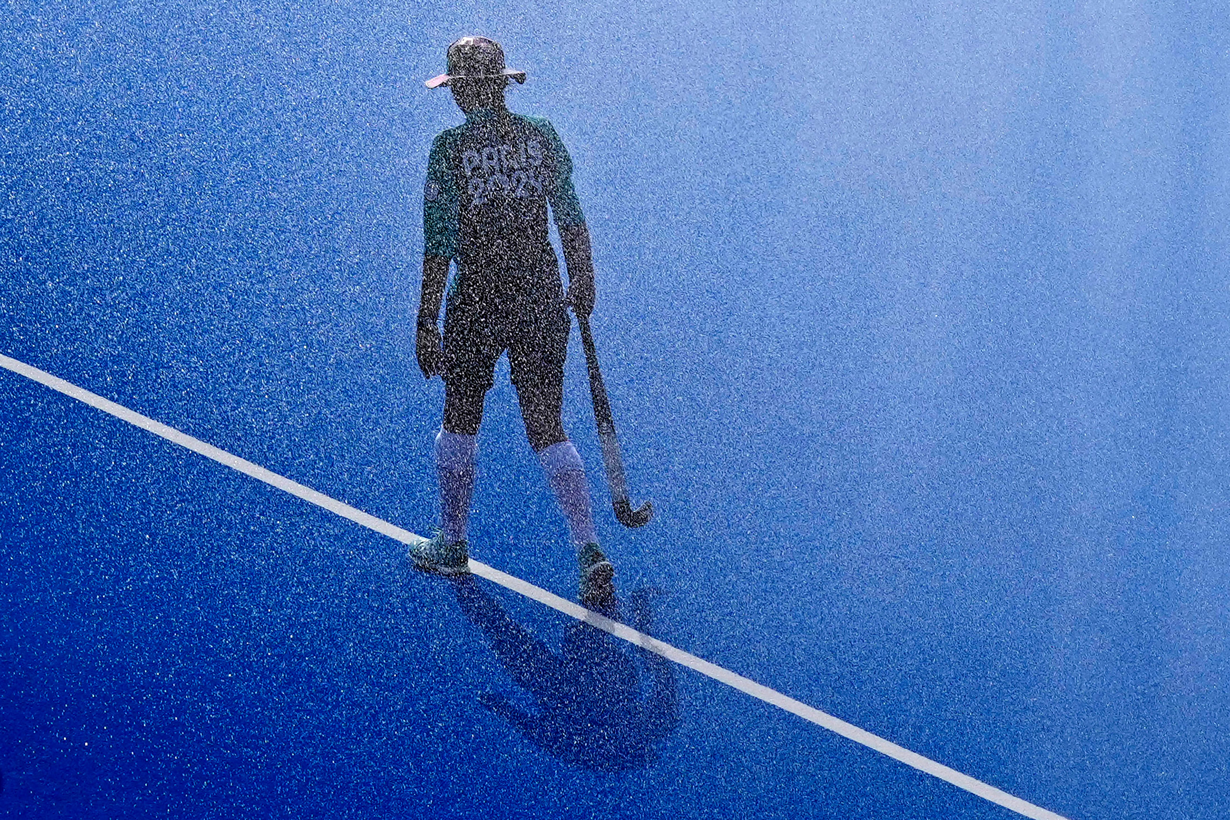 Water is sprayed on the pitch as a ball girl walks along the center line before the start of the men's Group A field hockey match between South Africa and Germany at the Yves-du-Manoir Stadium during the 2024 Summer Olympics, Tuesday, July 30, 2024, in Colombes, France. (Photo by Aijaz Rahi/AP Photo)