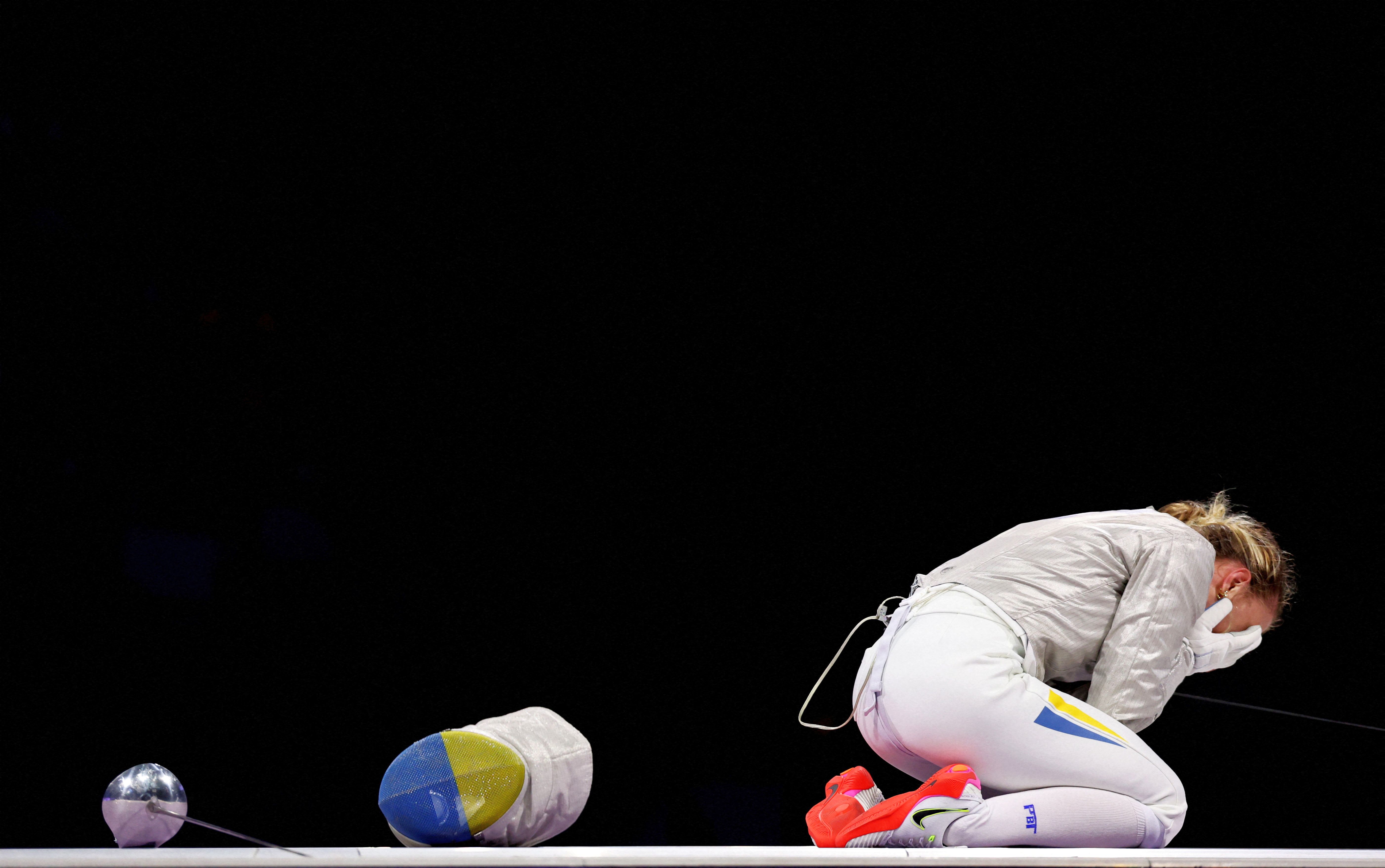 Olga Kharlan of Ukraine celebrates as she wins bronze medal after competing against Choi Se-bin (not seen) of South Korea in the Fencing Women's Foil Individual on day three of the Olympic Games Paris 2024 at Grand Palais in Paris, France on July 29, 2024. (Photo by Maye-E Wong/Reuters)