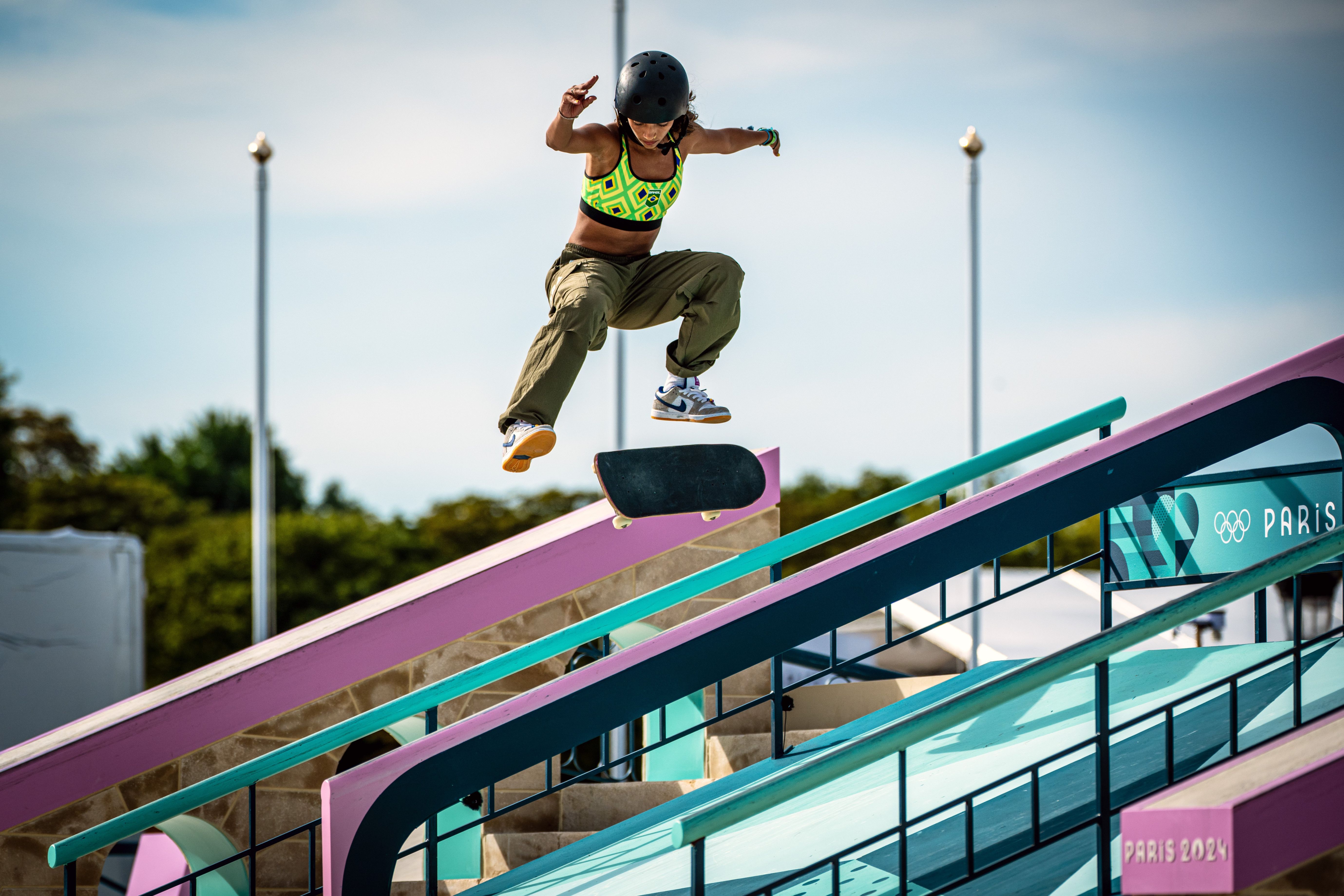 Rayssa Leal of Brazil successfully completes trick that wins her the bronze medal for third place in Womens Street Skateboarding heats during the XXXIII Olympic Games, Paris 2024 at La Concorde, Paris, France on July 28, 2024. (Photo by Richard Callis/SPP/Rex Features/Shutterstock)