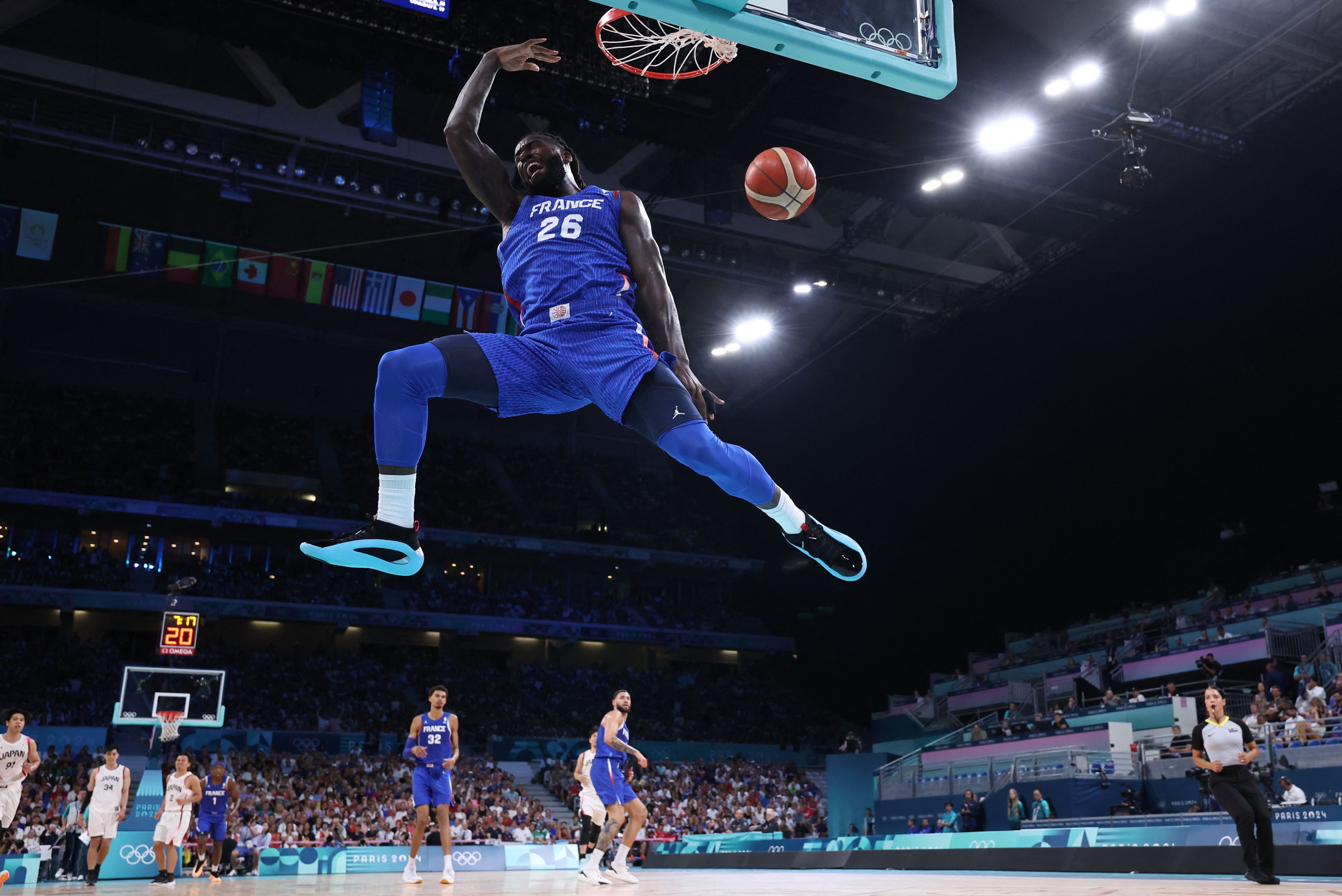 France's #26 Mathias Lessort dunks the ball in the men's preliminary round group B basketball match between Japan and France during the Paris 2024 Olympic Games at the Pierre-Mauroy stadium in Villeneuve-d'Ascq, northern France, on July 30, 2024. (Photo by Thomas Coex/AFP Photo)