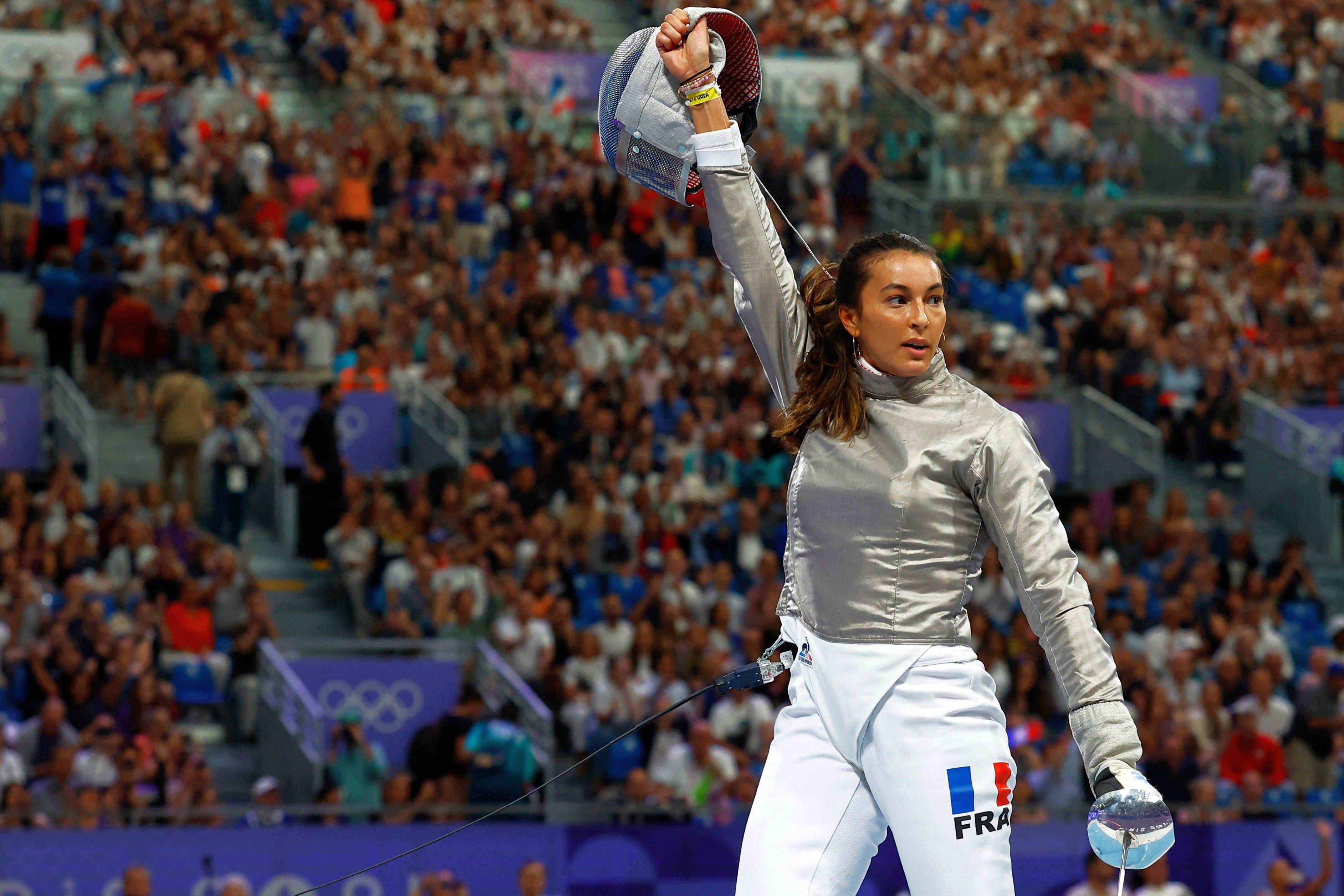 Sara Balzer of France competes with Olga Kharlan of Ukraine in the women's foil individual during the Paris Olympic Games 2024 on day 3 at Grand Palais on July 29, 2024 in Paris, France. (Photo by Albert Gea/Reuters)