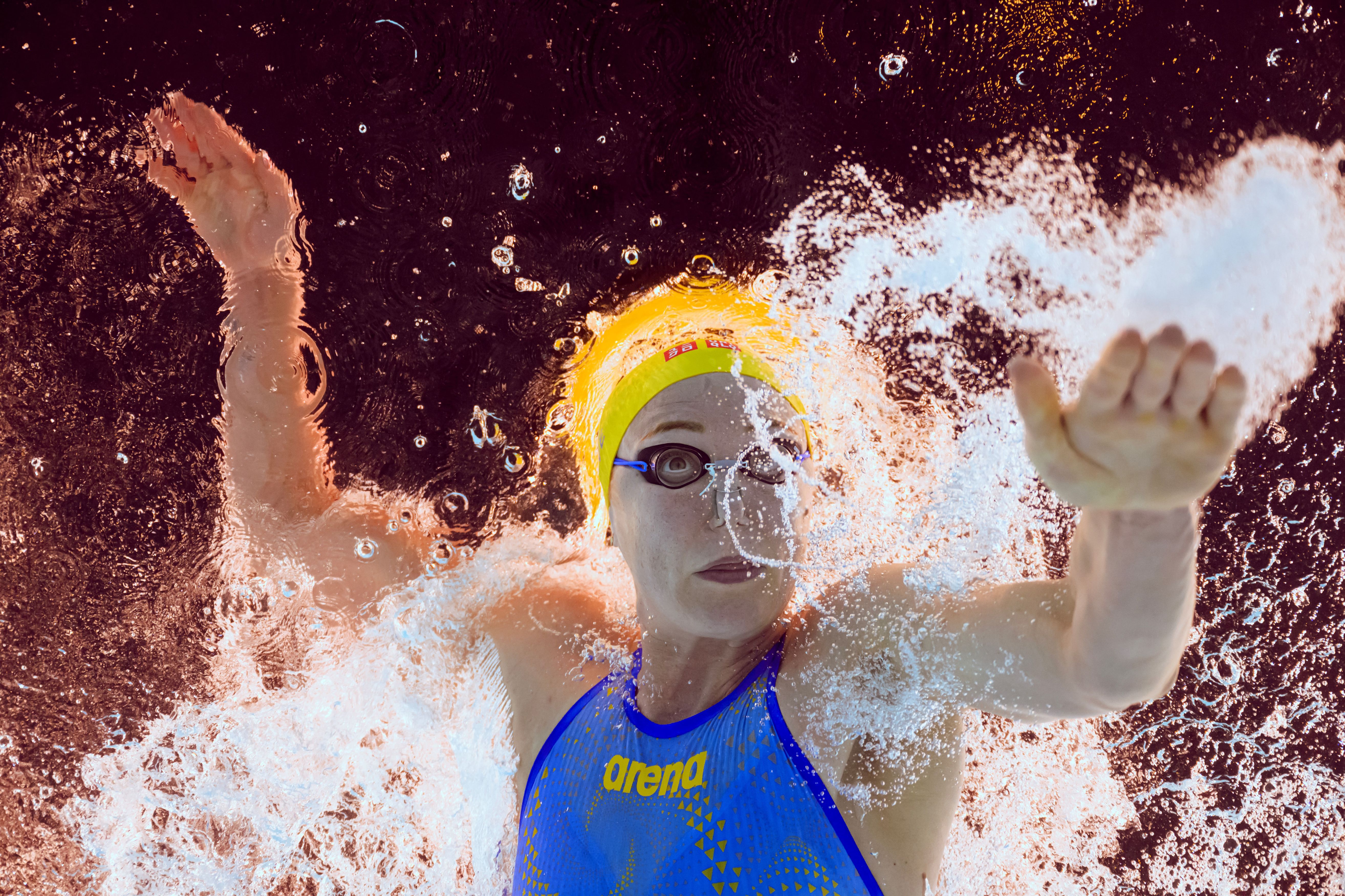An underwater view shows Sweden's Sarah Sjoestroem competing in a heat of the women's 100m freestyle swimming event during the Paris 2024 Olympic Games at the Paris La Defense Arena in Nanterre, west of Paris, on July 30, 2024. (Photo by Oli Scarff/AFP Photo)