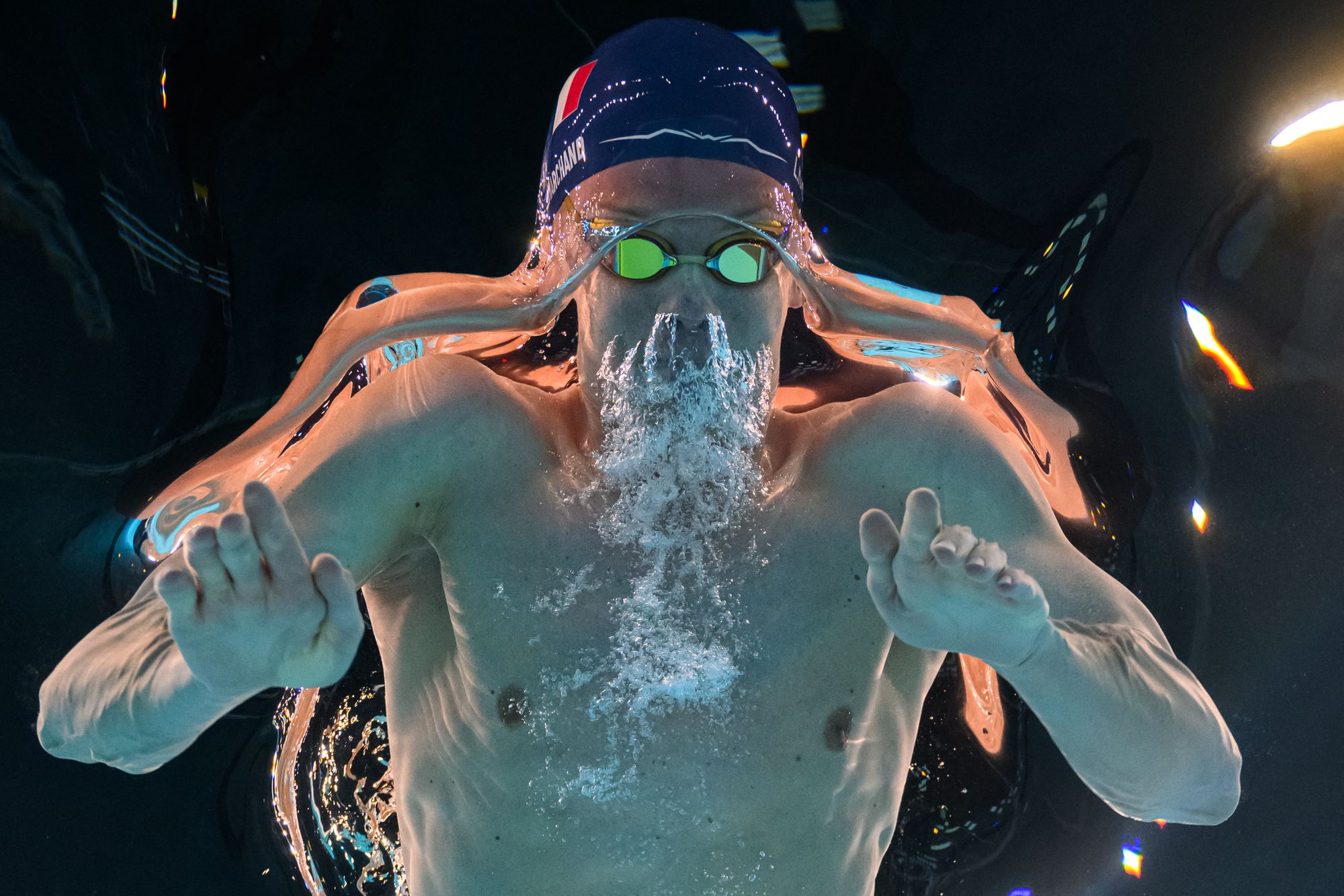 An underwater view shows France's Leon Marchand competing in the final of the men's 400m individual medley swimming event during the Paris 2024 Olympic Games at the Paris La Defense Arena in Nanterre, west of Paris, on July 28, 2024. (Photo by François-Xavier Marit/AFP Photo)