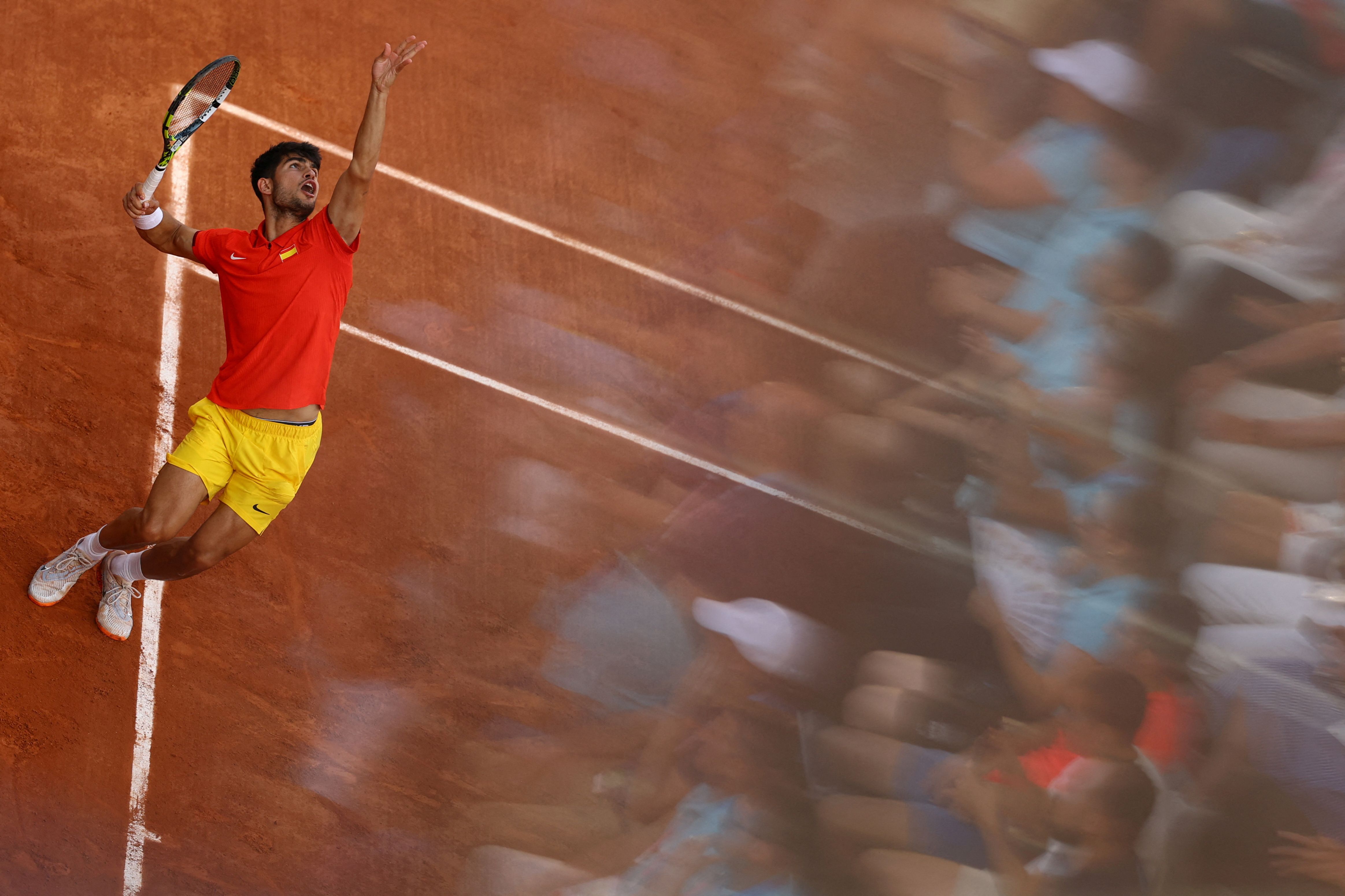 Carlos Alcaraz of Spain in action during his match against Tallon Griekspoor of the Netherlands in the men's tennis singles second round at the Paris Olympics on July 29, 2024. (Photo by Kai Pfaffenbach/Reuters)