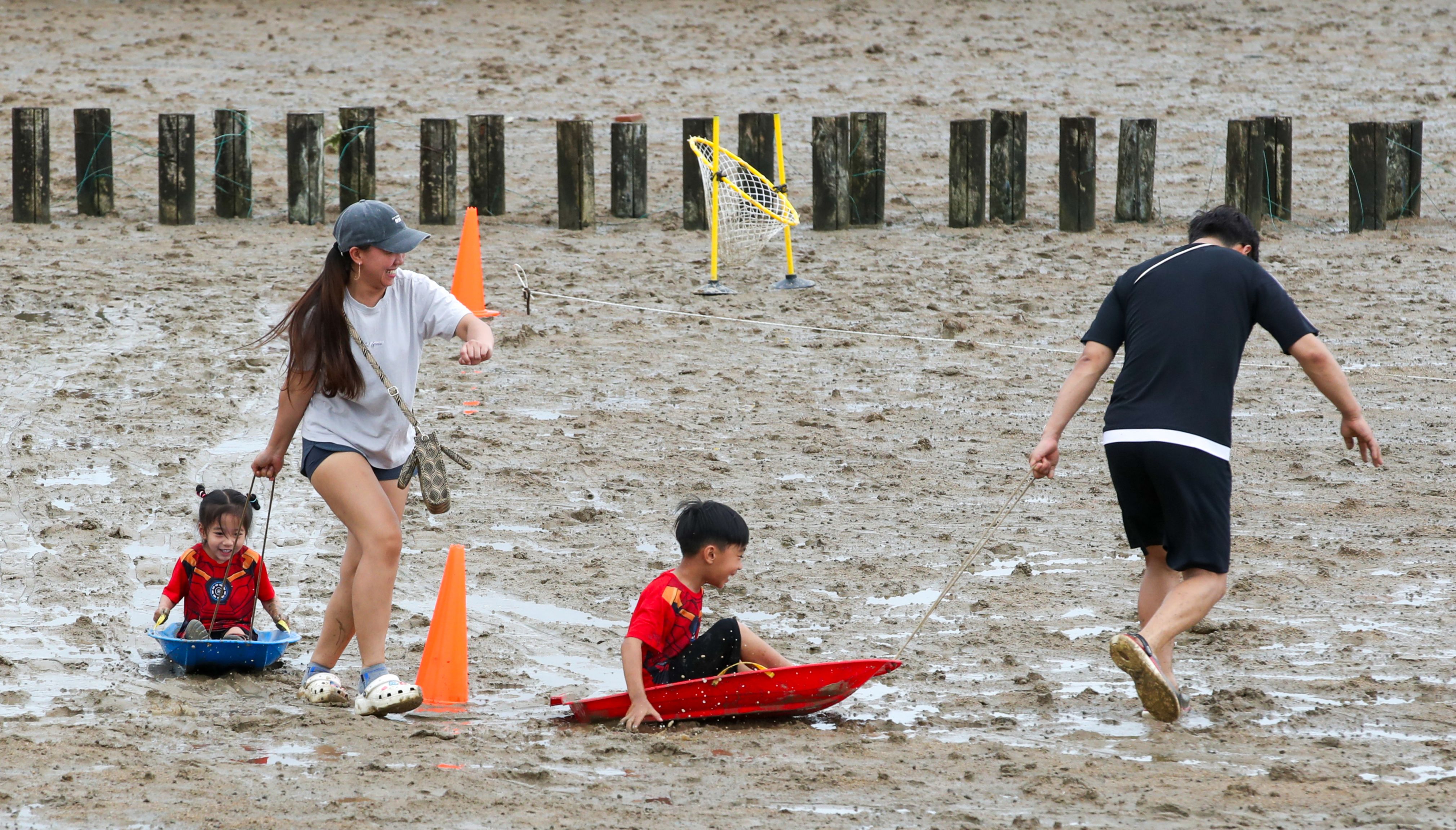 A family participating in the 10th Muan Red Clay Tidal Flat Festival held at Muan Red Clay Tidal Flat Land, Haeje-myeon, Muan-gun, Jeollanam-do on the 23rd, 2024 is having a good time in the mud field. (Photo by Kim Young-geun)