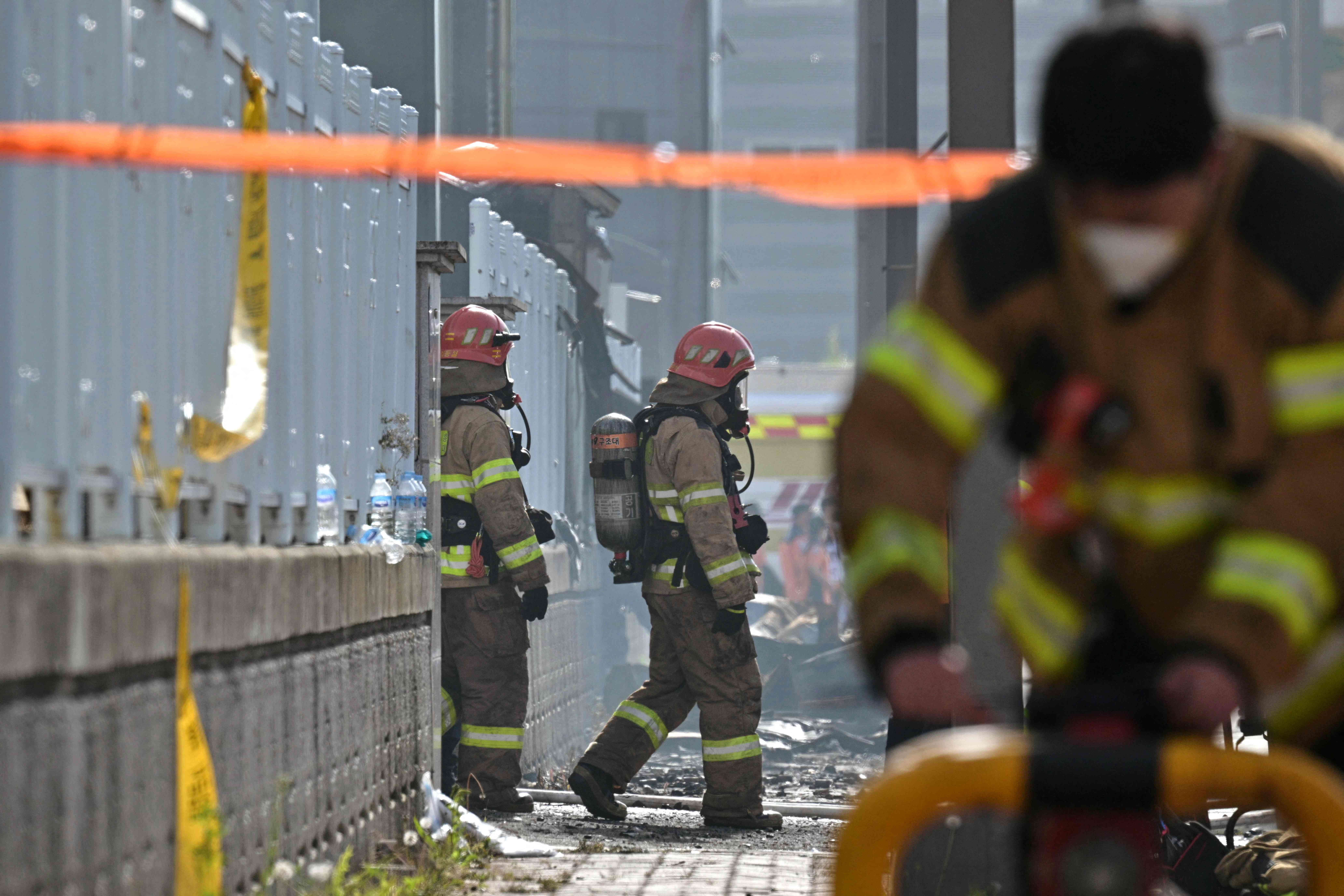 Firefighters walk at the scene of a fire at a lithium battery factory owned by South Korean battery maker Aricell in Hwaseong on June 24, 2024. Around 20 bodies have been found at a South Korean lithium battery factory after a massive blaze on June 24, the Yonhap news agency said, with firefighters saying they were still searching the building. (Photo by Anthony Wallace/AFP Photo)