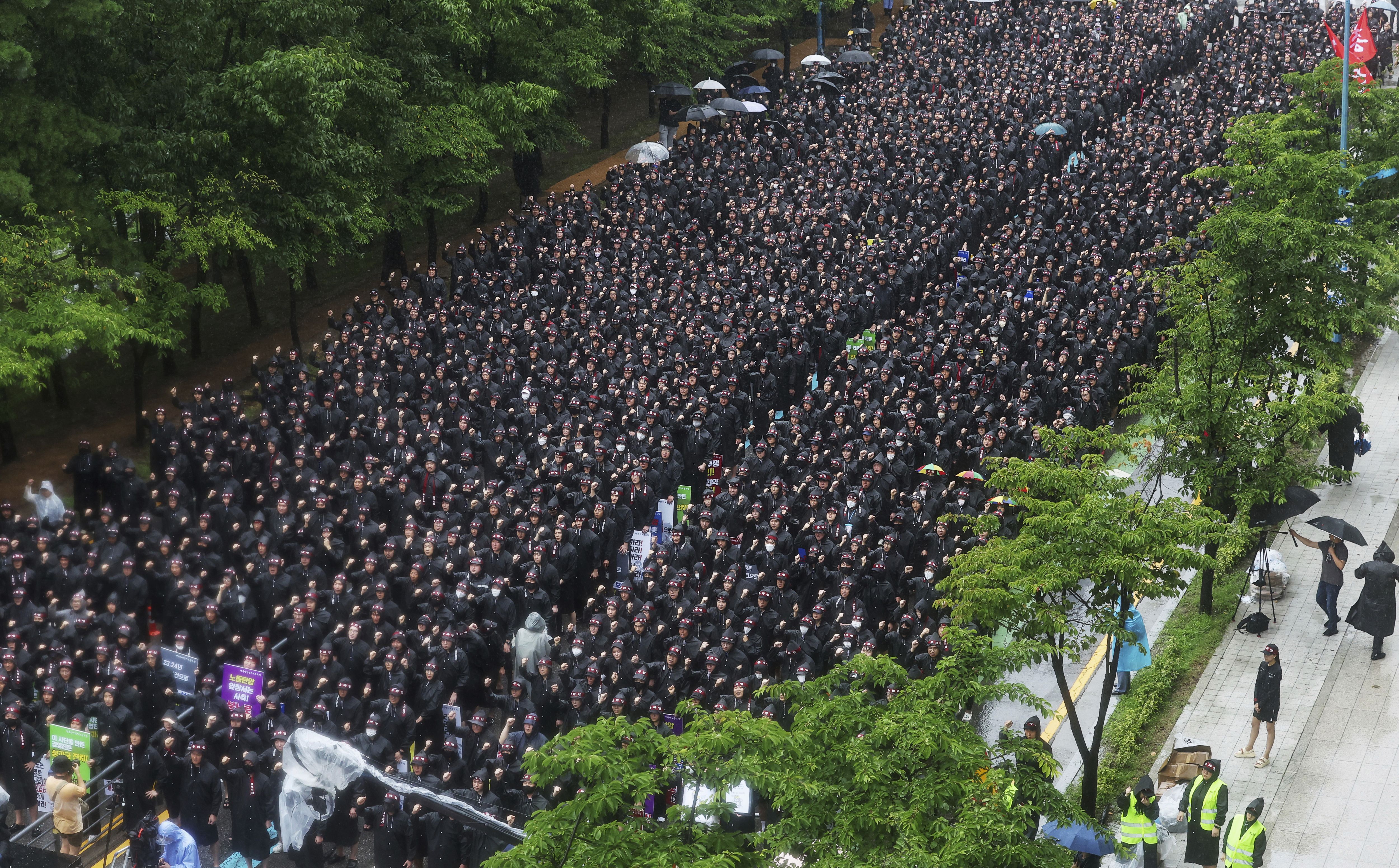Members of the National Samsung Electronics Union gather during a rally as they began a three-day general strike outside of Samsung Electronics' Hwaseong campus in Hwaseong, South Korea, Monday, July 8, 2024. (Photo by Hong Ki-won/Yonhap via AP Photo)