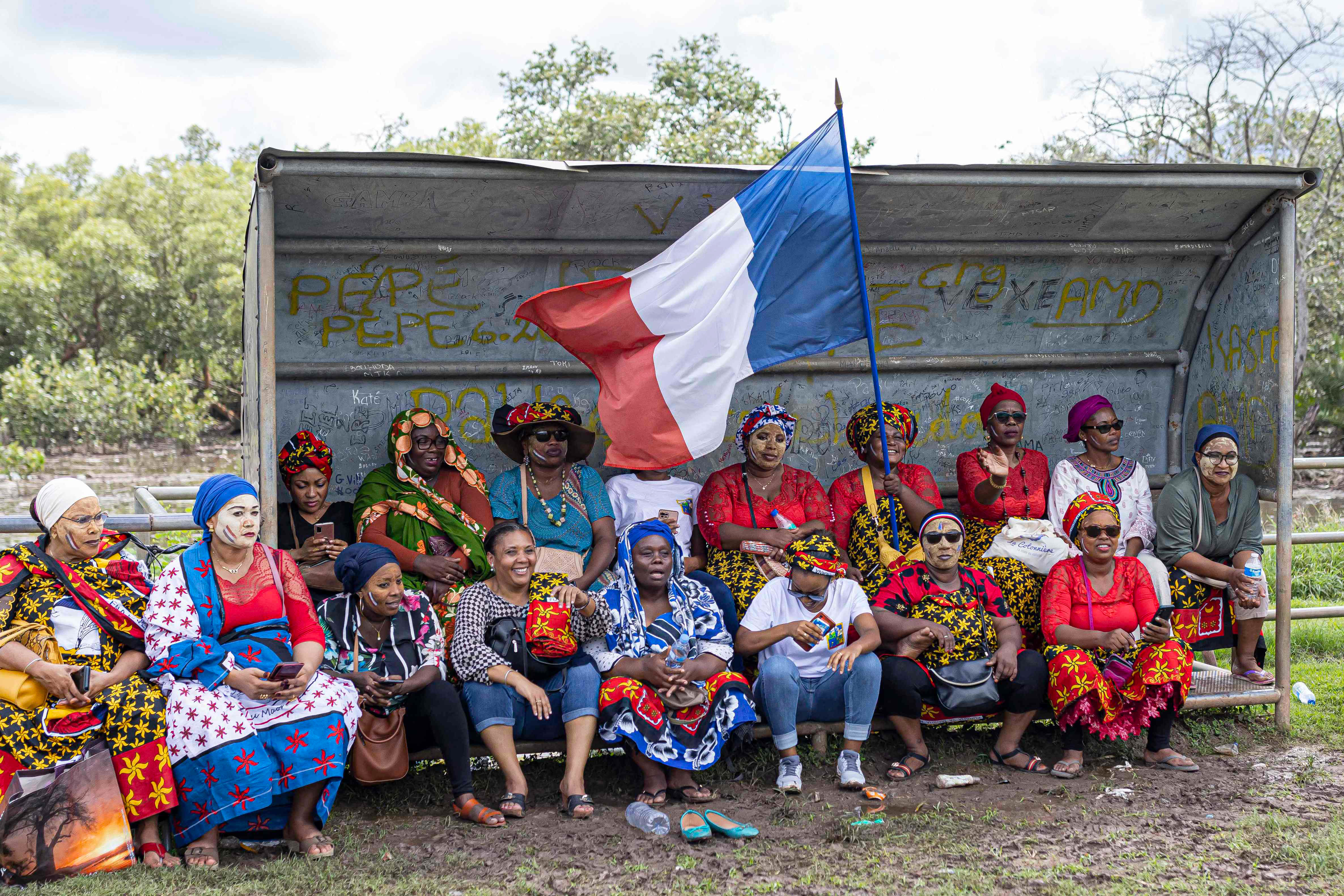 A woman holds a French flag as she and others listen to a speech during a rally in support of Operation Wuambushu (“Take Back”) in Chirongui, on the island of Mayotte, on April 27, 2023. Authorities in Mayotte were expected to launch Operation Wuambushu as early as this weekend to remove illegal migrants who have settled in slums on the island, with more than 2,000 police and administrative officials mobilised to set in train the expulsions of those illegally on the island and tear down the makeshift squats housing them. (Photo by Patrick Meinhardt/AFP Photo)