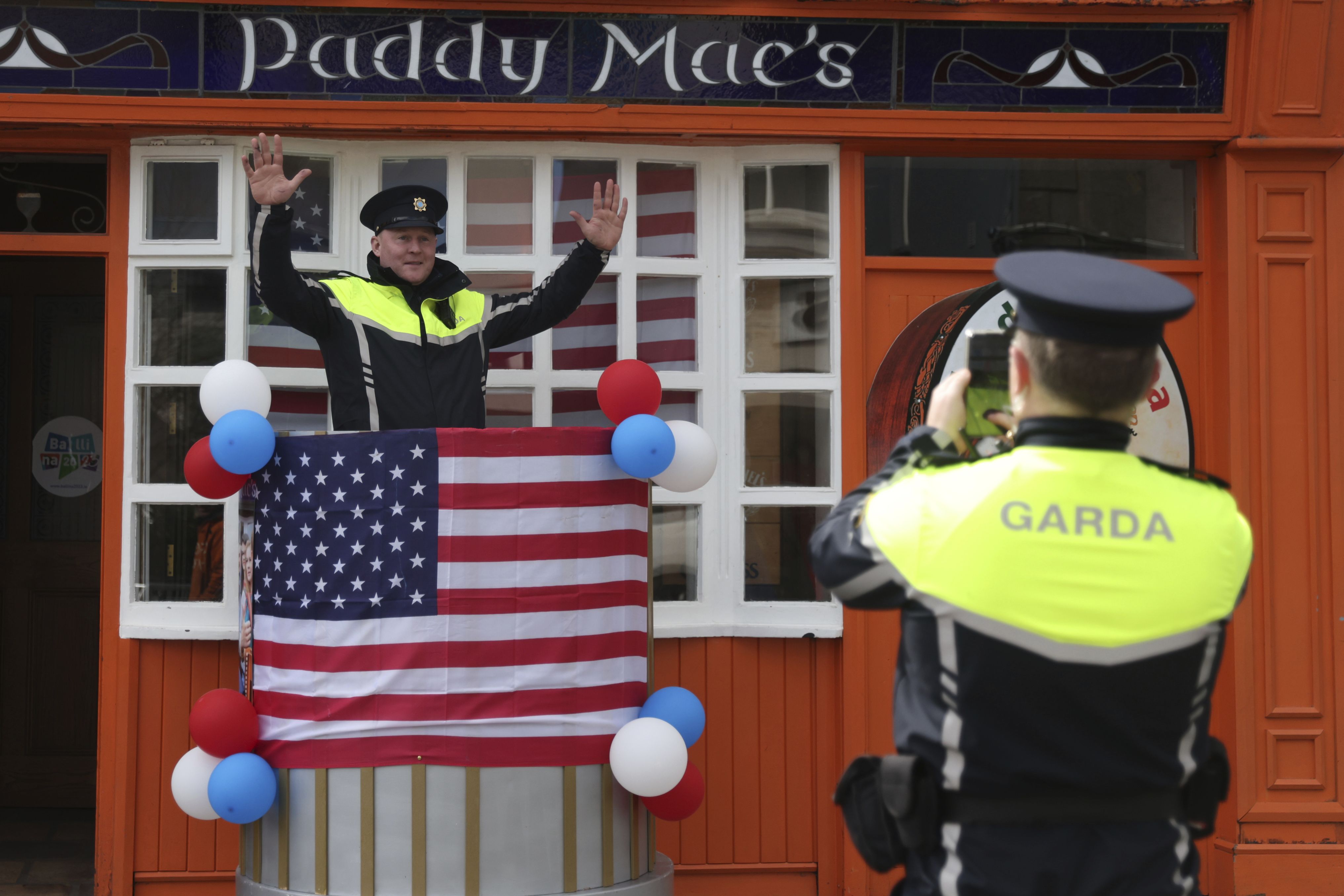 An Irish police officer poses for a colleague to take a photo as last minute preparation are made with bunting and US flags put up in the town of Ballina ahead of the visit by President Joe Biden to St Muredach's Cathedral, in Ballina, Ireland, Friday, April 14, 2023. The President will give a speech later Friday outside the cathedral. (Photo by Peter Morrison/AP Photo)