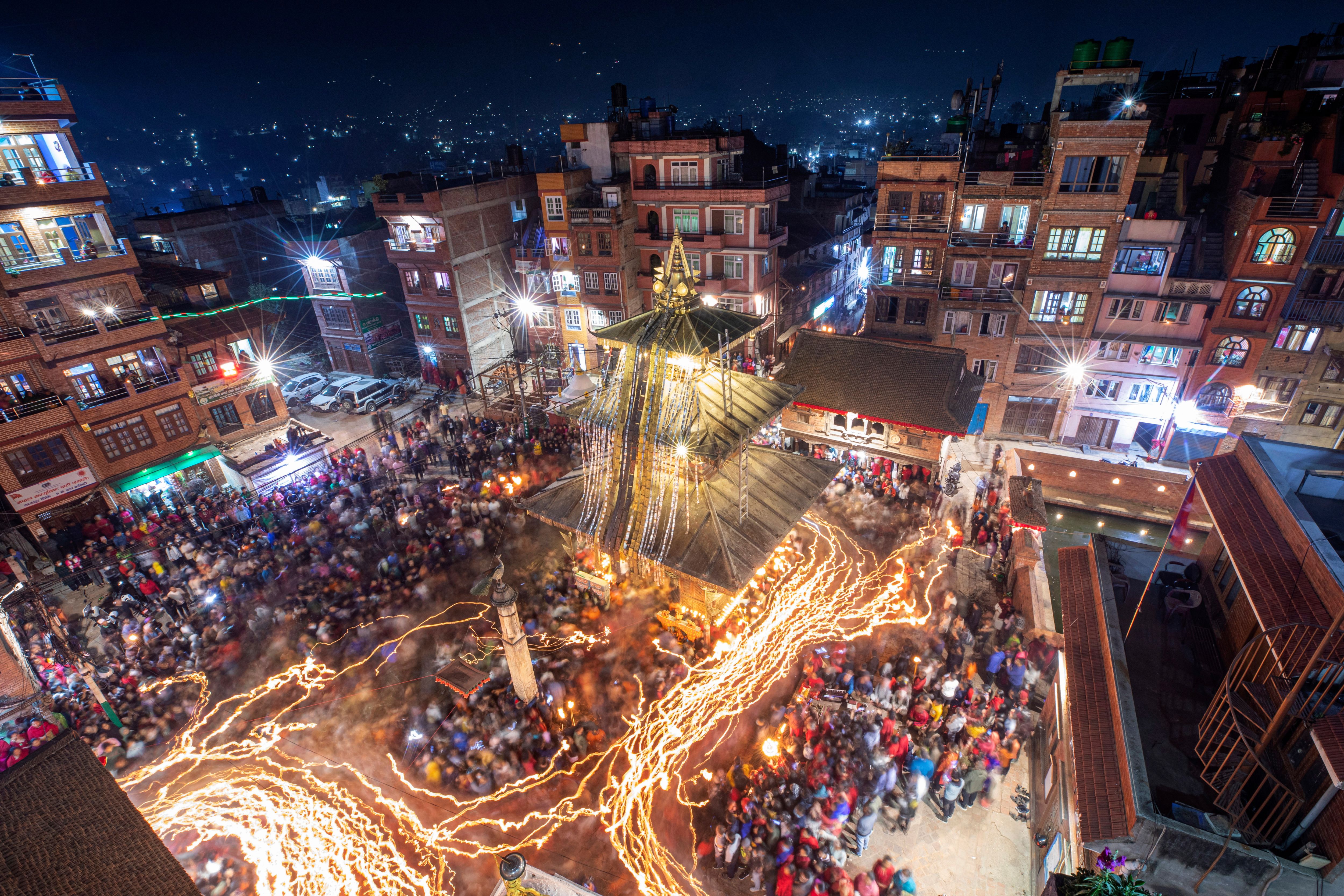 People carry a ceremonial palanquin and torches during the “Biska Jatra” festival in Thimi, on the outskirts of Kathmandu, Nepal, 14 April 2023. Thousands of people gathered early morning to attend “Biska Jatra”, which is celebrated in hope of protection from all natural calamities and support for a good harvest for the coming year, which marks 2080 in the Nepali calendar, especially by the ethnic Newar communities in Bhaktapur. (Photo by Narendra Shrestha/EPA/EFE)
