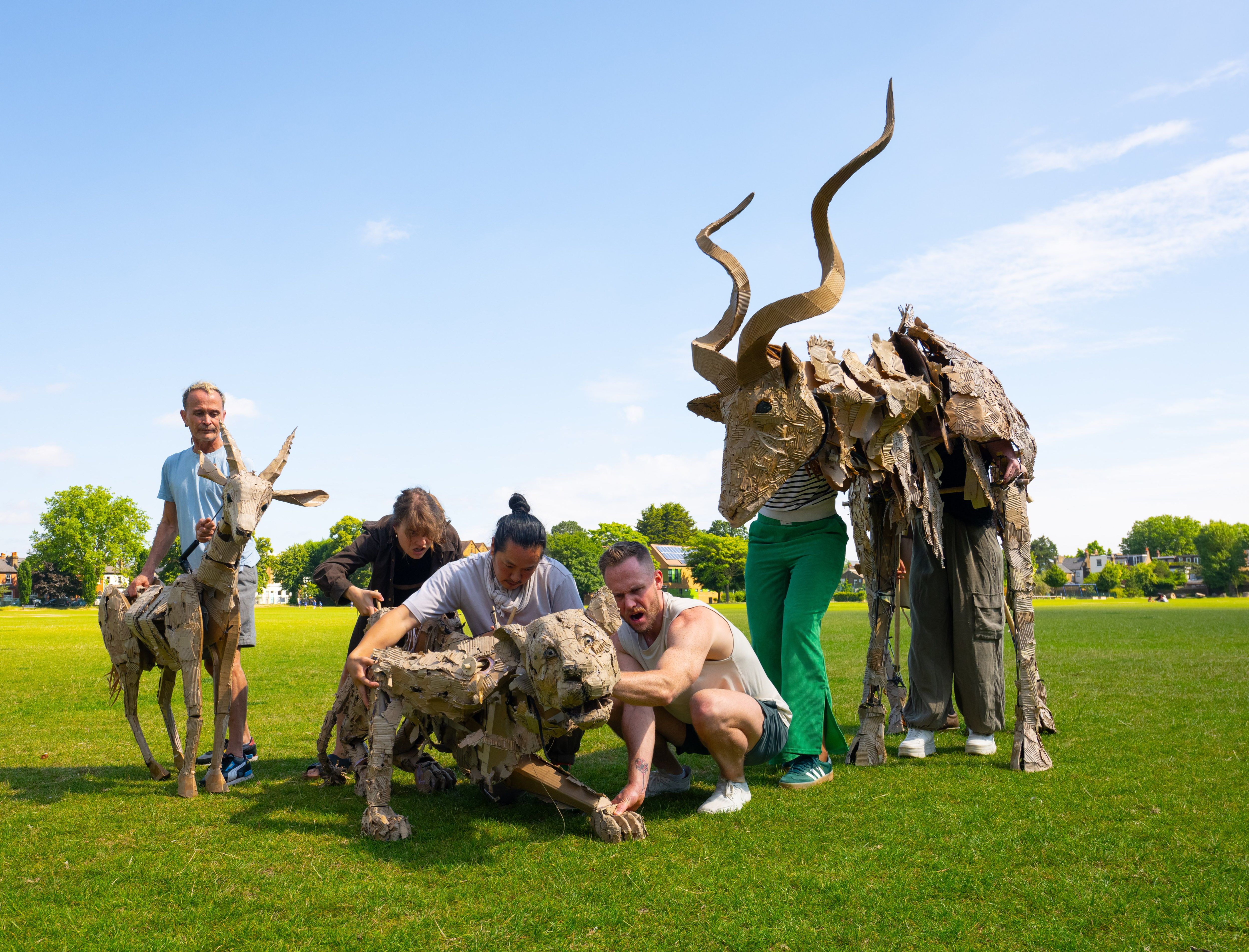 Life-size puppets of wild animals in the last decade of June 2024 rehearse for the launch of The Herds, a new project from the team behind Little Amal, the 12ft puppet of a Syrian refugee girl at Wimbledon College of Arts, London. In the public art event the puppets will journey across Europe and Africa in 2025, to represent fleeing a climate disaster. (Photo by Elliott Franks/The Times)