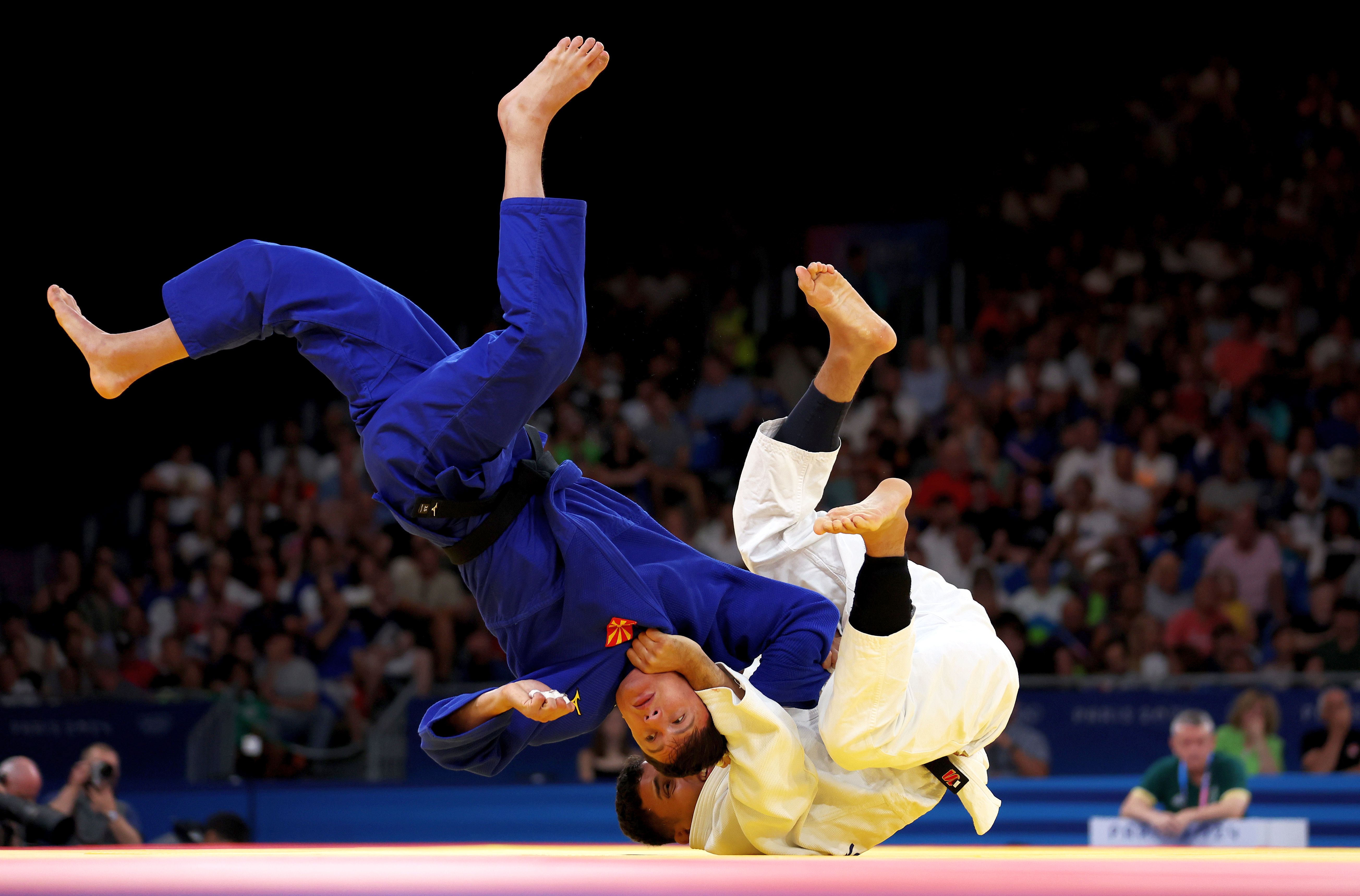 Guilherme Schimidt of Team Brazil and Edi Sherifovski of Team North Macedonia compete during the Men’s -81kg Elimination Round of 32 match between Guilherme Schimidt of Team Brazil and Edi Sherifovski of Team North Macedonia on day four of the Olympic Games Paris 2024 at Champs-de-Mars Arena on July 30, 2024 in Paris, France. (Photo by Steph Chambers/Getty Images)