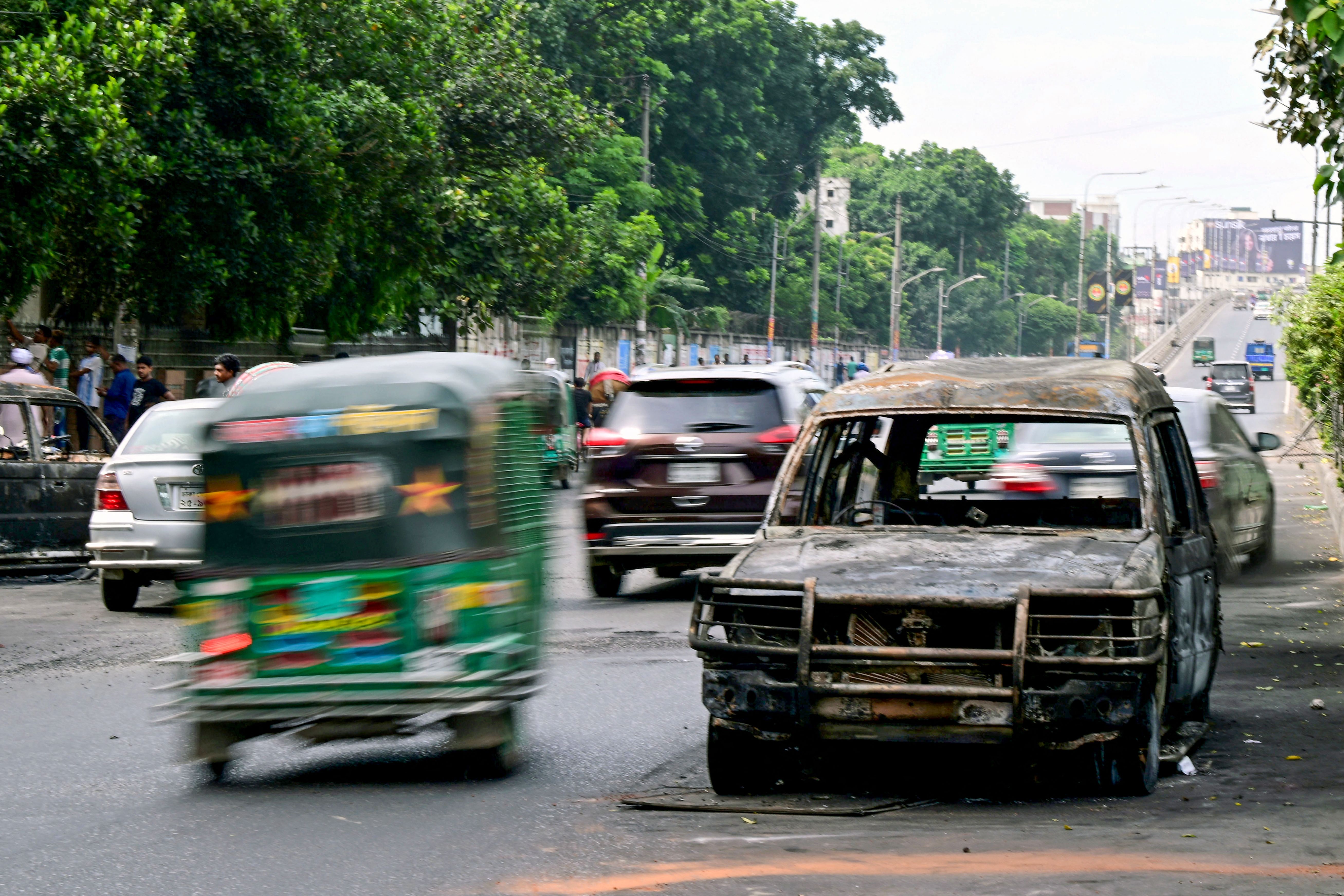 Commuters drive past a burnt car after students set it on fire amid the ongoing anti-quota protest in Dhaka on July 19, 2024. Bangladesh woke on July 19 to survey destruction left by the deadliest day of ongoing student protests so far, which saw government buildings torched by demonstrators and a nationwide internet blackout put into effect. (Photo by Munir Uz Zaman/AFP Photo)