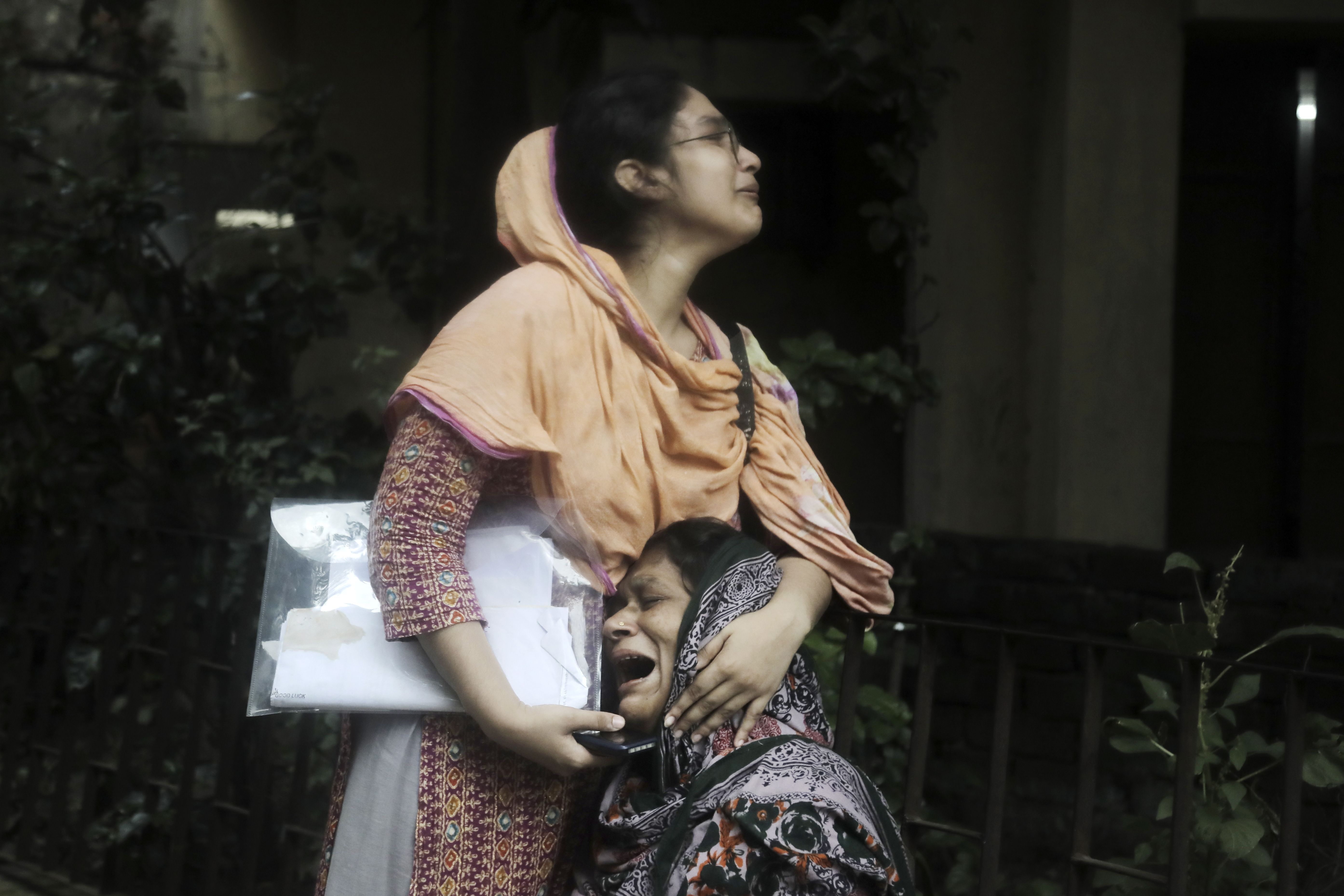 Sanjida, left, consoles her mother as she breaks into tears after receiving the dead body of her son, who was shot during a clash between the police and anti-quota protesters, at a morgue in Dhaka, Bangladesh, Monday, July 22, 2024. Internet and mobile data services are still down despite apparent calm in Bangladesh following a verdict that scaled back a controversial quota system for government jobs after weeks of relentless protests that turned deadly. (Photo by Anik Rahman/AP Photo)
