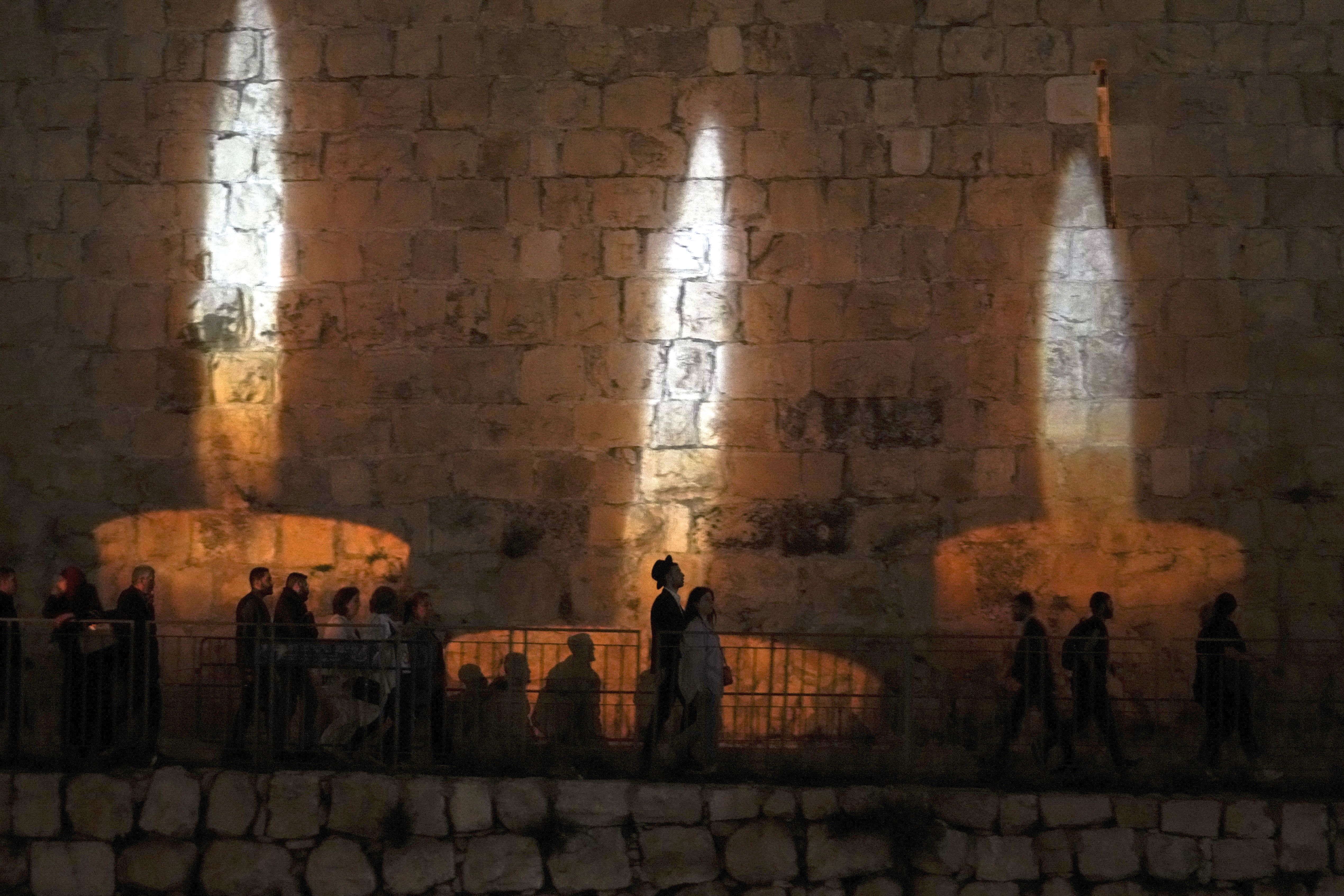 People walk by an image of memorial candles, projected on the walls of Jerusalem's Old City on the eve of annual Holocaust Remembrance Day, Monday, April 17, 2023. Israel holds the day of remembrance each year to remember the six million Jewish victims of the Nazi genocide during World War II. (Photo by Mahmoud Illean/AP Photo)