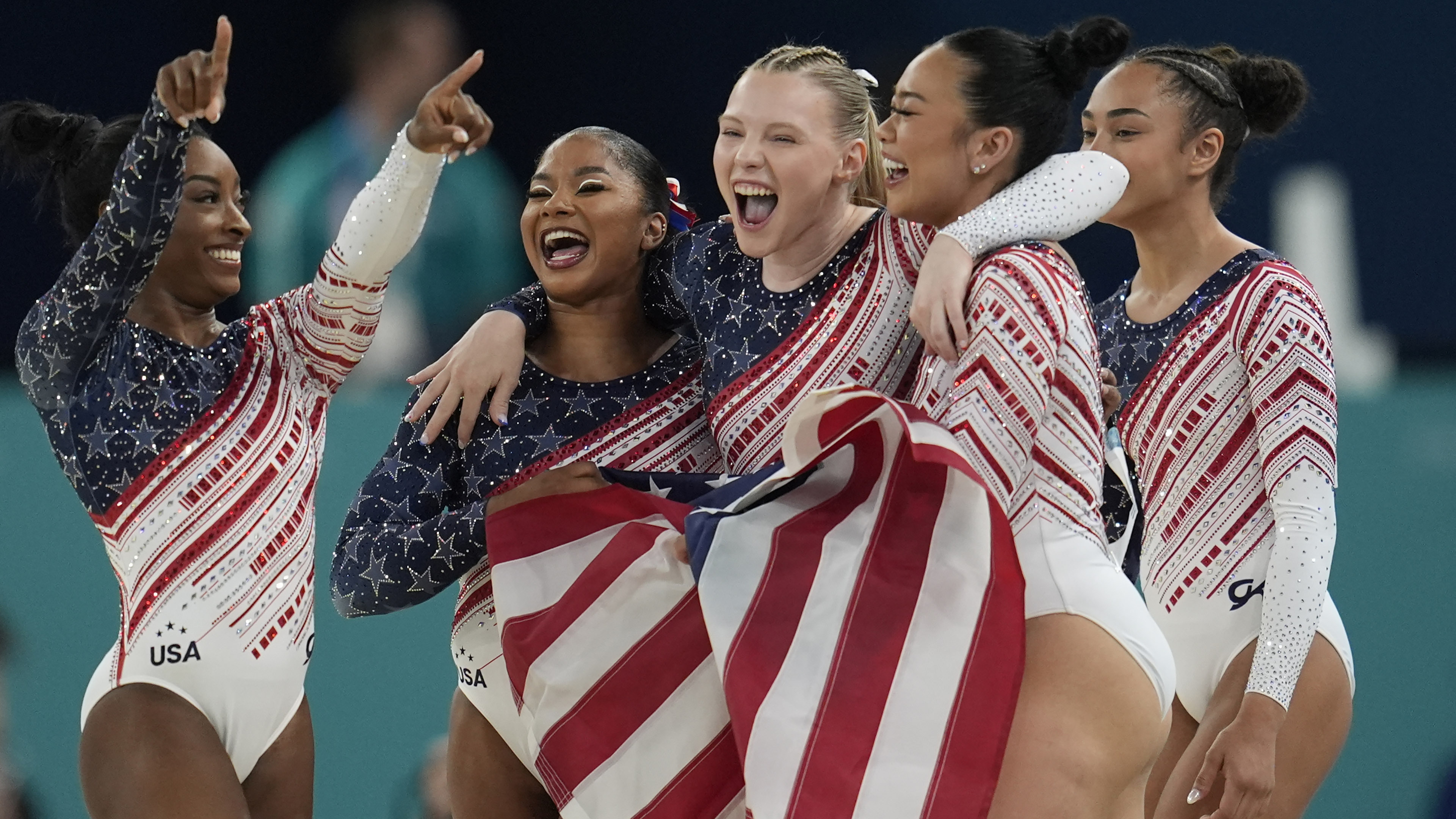 Members of Team USA celebrate after winning the gold medal during the women's artistic gymnastics team finals round at Bercy Arena at the 2024 Summer Olympics, Tuesday, July 30, 2024, in Paris, France. (Photo by Abbie Parr/AP Photo)