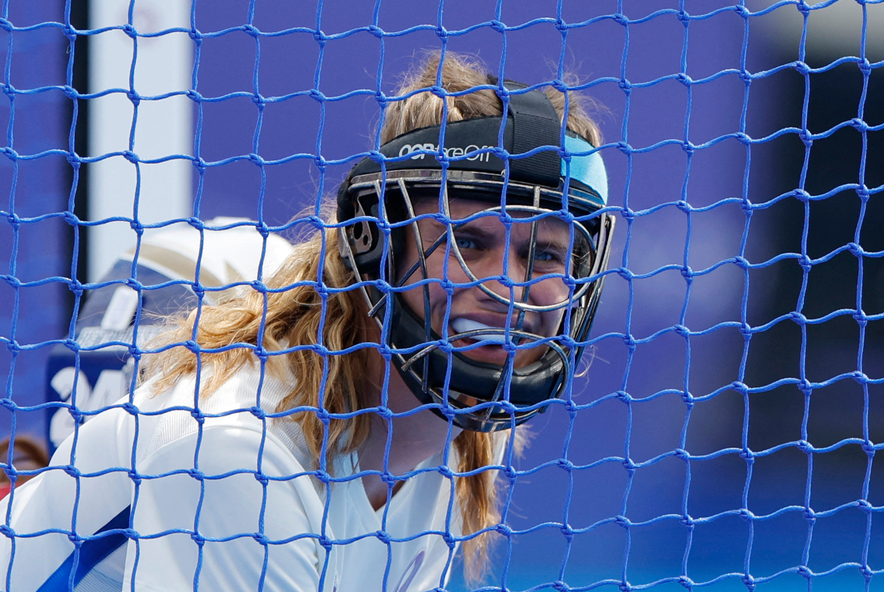 Catherine Clot of France defends her goal during the women’s hockey match against Germany at Yves-du-Manoir Stadium in Colombes, France on July 31, 2024. *Photo by Adnan Abidi/Reuters)