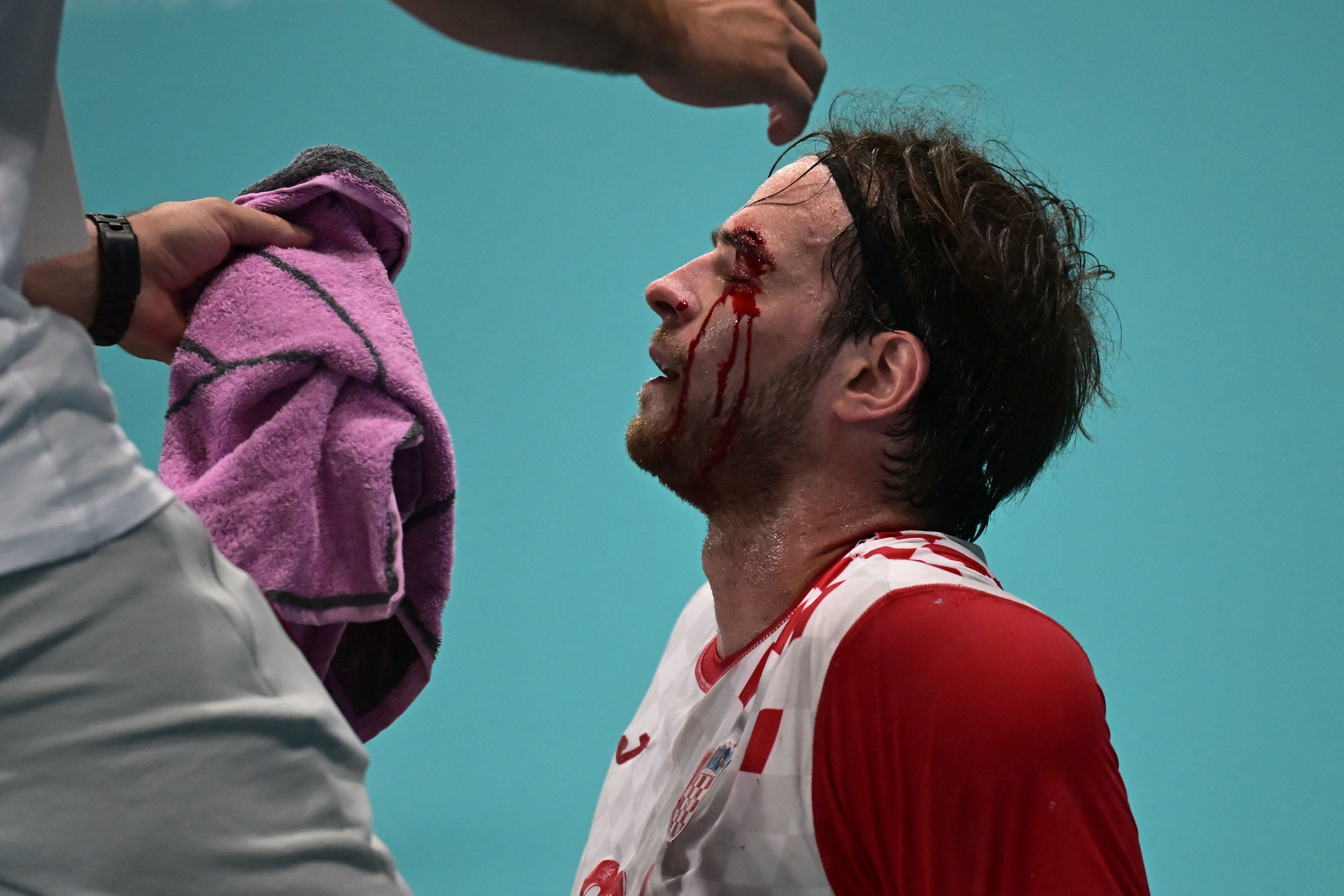 Croatia's pivot #93 Veron Nacinovic receives medical attention after sustaining an injury during the Men's Preliminary Round Group A handball match between Croatia and Germany of the Paris 2024 Olympic Games, at the Paris South Arena in Paris, on July 31, 2024. (Photo by Damien Meyer/AFP Photo)