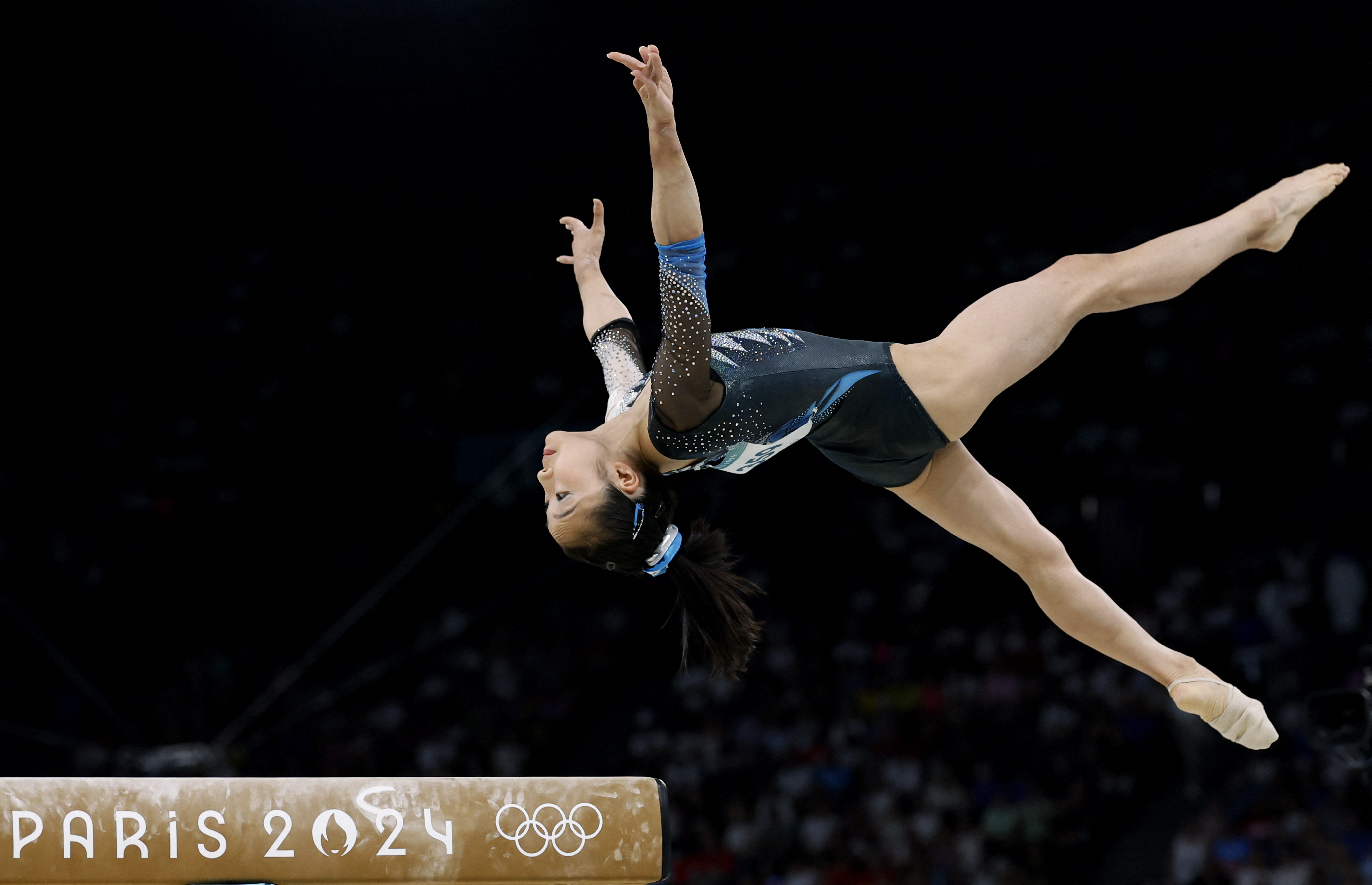 Mana Okamura of Japan performs her routine on the balance beam in the women’s team final in artistic gymnastics in Paris on July 30, 2024. The four-member team finished eighth. (Photo by Amanda Perobelli/Reuters)