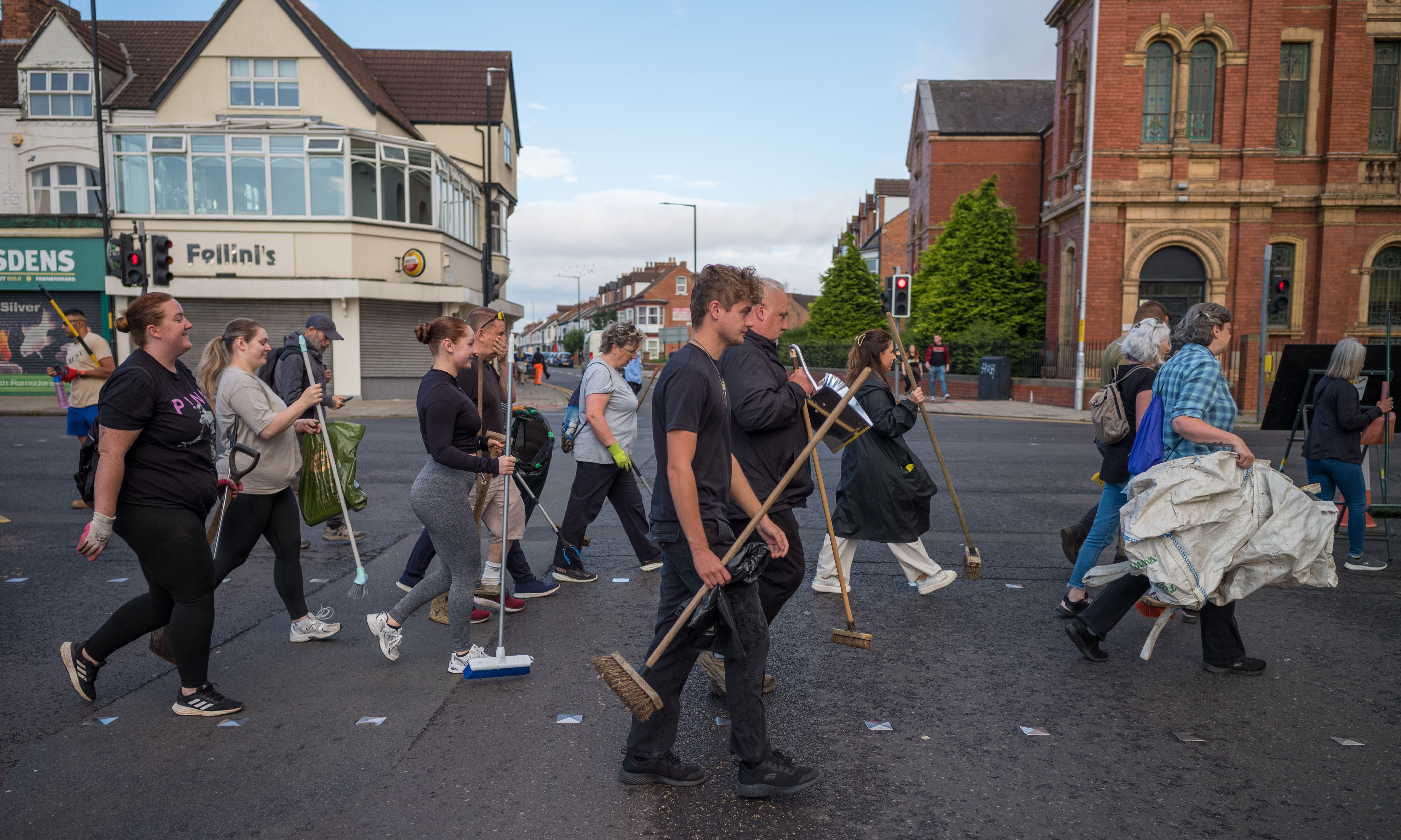 Members of the Middlesbrough community come together to clean up their streets after far-right activists destroyed property following riots on August 05, 2024 in Middlesbrough, England. Dozens of people have been arrested after a violent protest here yesterday, in which a car was set alight, windows were smashed, and objects were thrown at police. (Photo by Ian Forsyth/Getty Images)