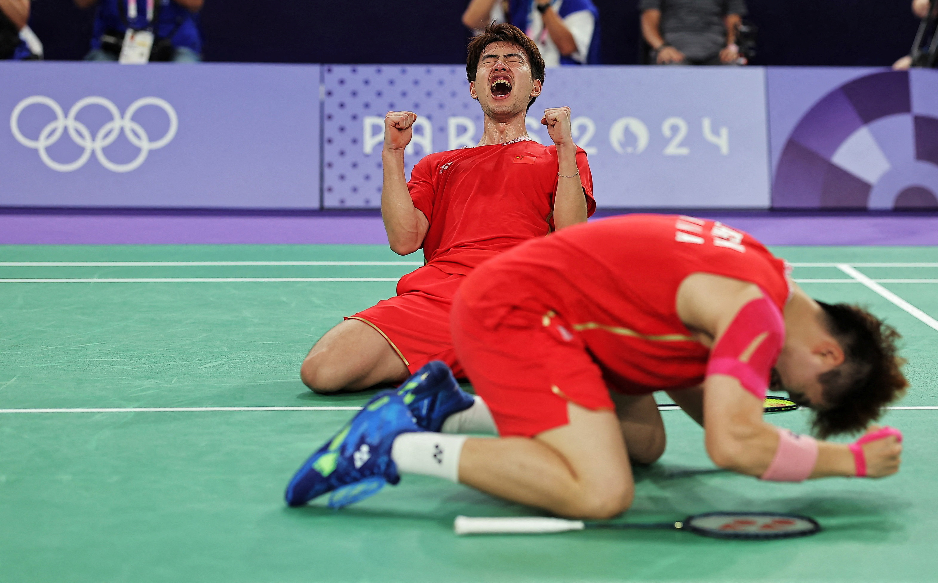 Wei Keng Liang and Chang Wang of China celebrate after winning the match against Fajar Alfian and Muhammad Rian Ardianto of Indonesia during the men's doubles badminton quarterfinals at the Porte de la Chapelle Areana in Paris, France on August 01, 2024. (Photo by Ann Wang/Reuters)