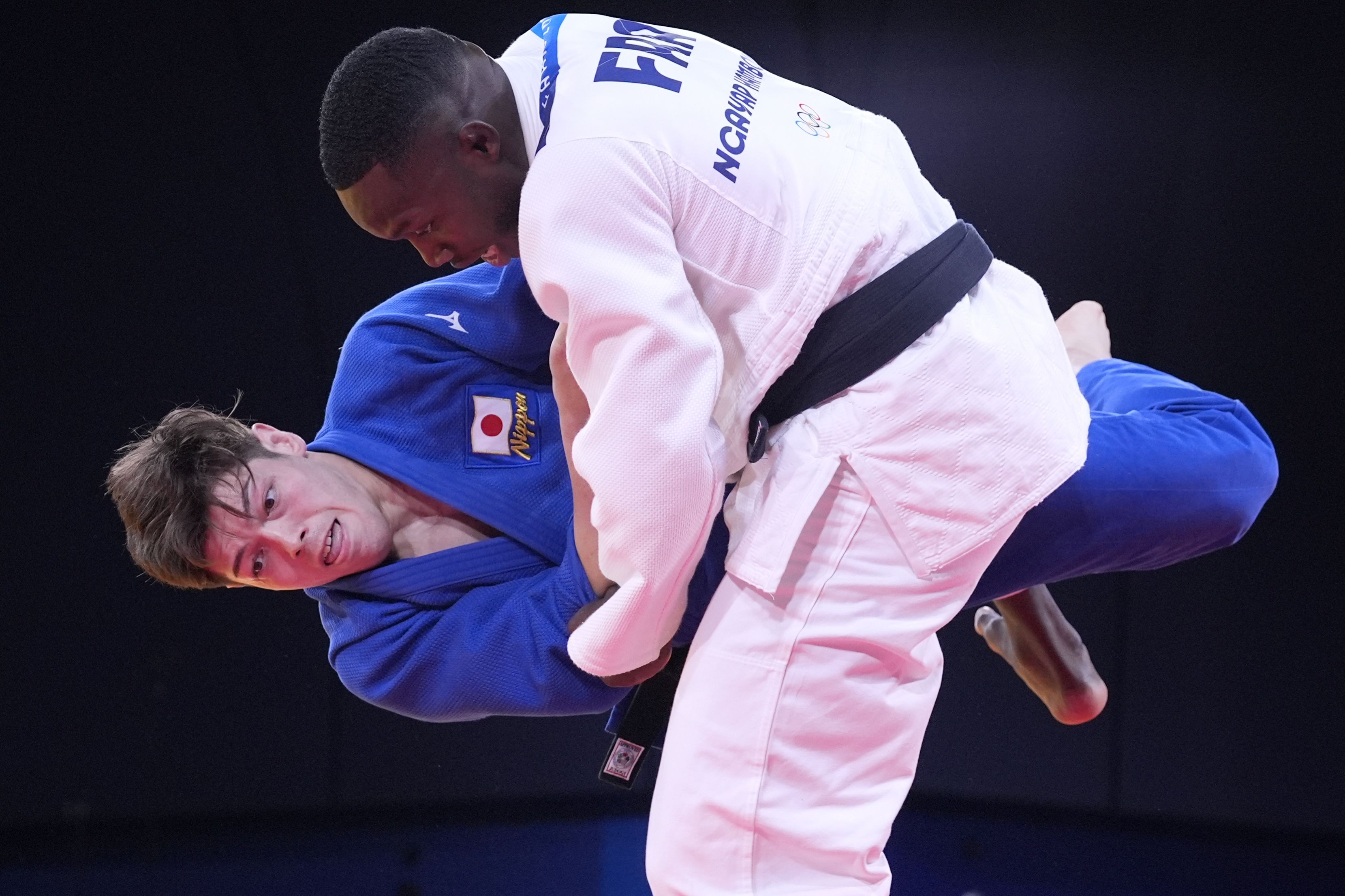 France's Maxime-Gael Ngayap Hambou and Japan's Sanshiro Murao compete during their men's -90 kg semifinal match in the team judo competition, at Champ-de-Mars Arena, during the 2024 Summer Olympics, Wednesday, July 31, 2024, in Paris, France. (Photo by Eugene Hoshiko/AP Photo)