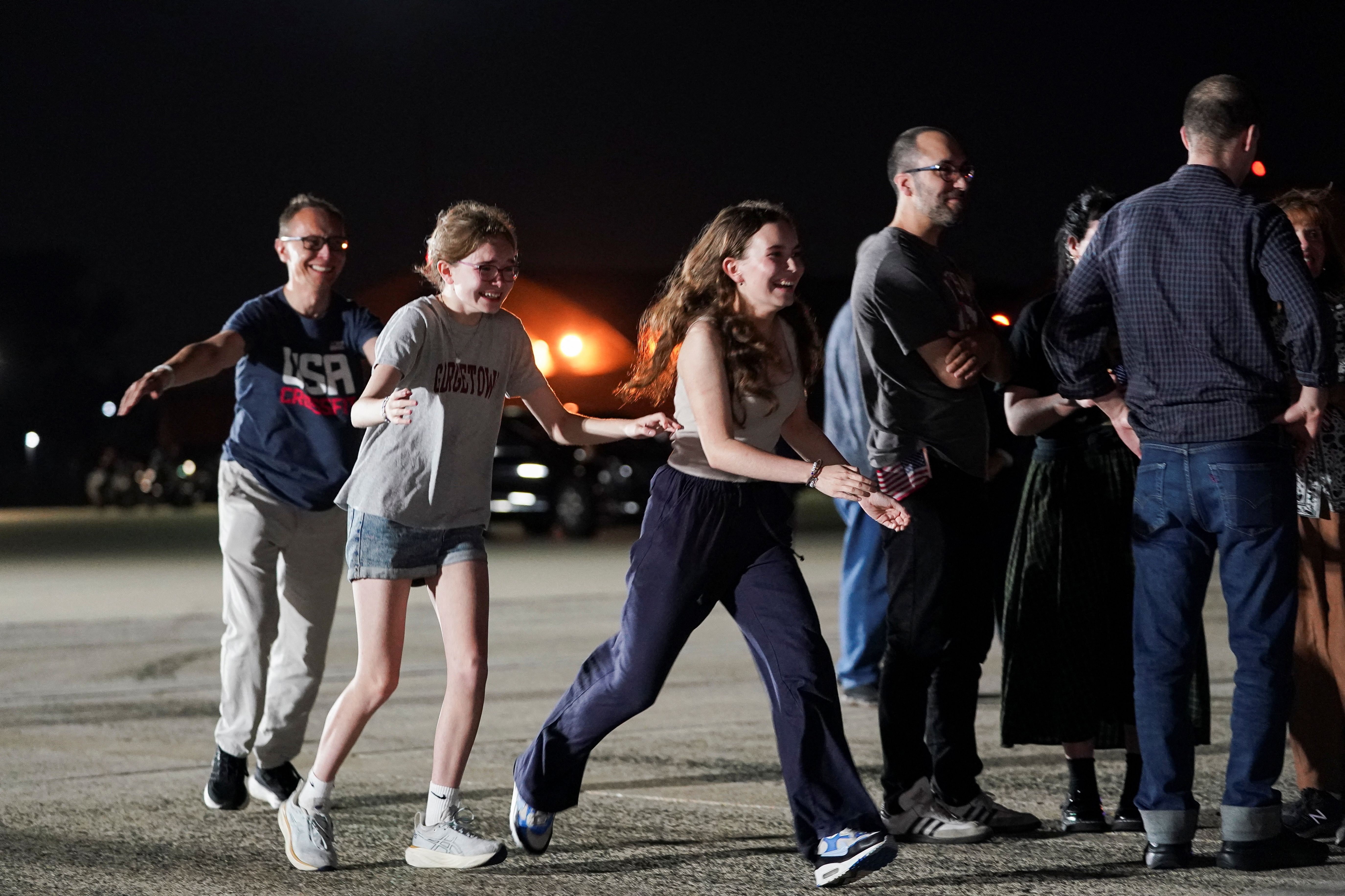 Russian-American journalist Alsu Kurmasheva's daughters Bibi and Miriam Butorin, and husband Pavel Butorin, run to meet her, upon her arrival at Joint Base Andrews, after her release from detention in Russia, in Maryland, U.S., August 1, 2024. (Photo by Nathan Howard/Reuters)