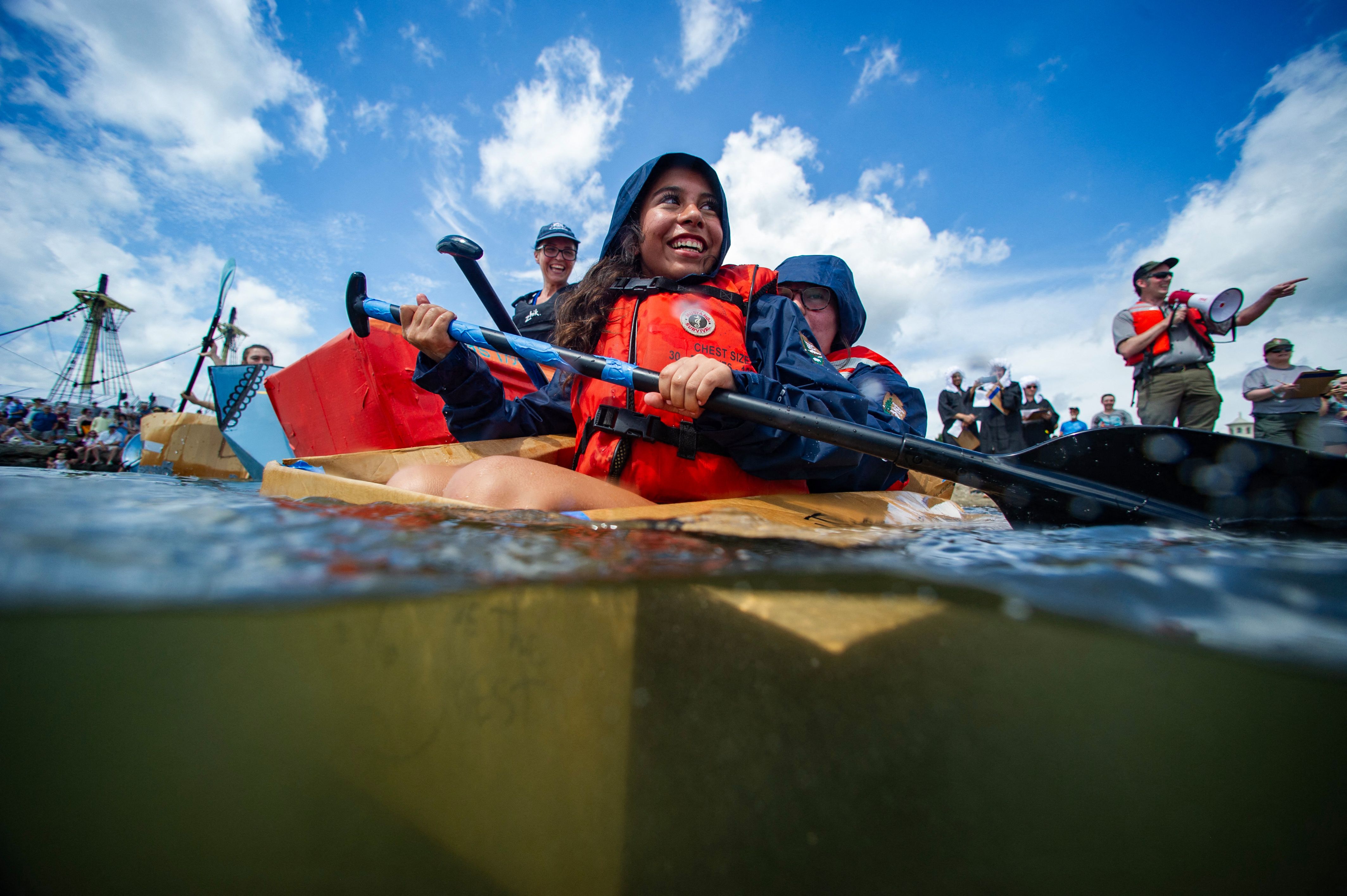 A crew sits in a square box hoping to make it off the beach during the Great Salem Maritime Cardboard Boat Regatta as part of the at Salem Merry-time Fest in Salem, Massachusetts on August 3, 2024. The custom boats made from corrugated cardboard and duct tape, must fit at least two people and compete in a set of heats, racing from Derby Beach to a buoy and back to the beach to win prizes. (Photo by Joseph Prezioso/AFP Photo)