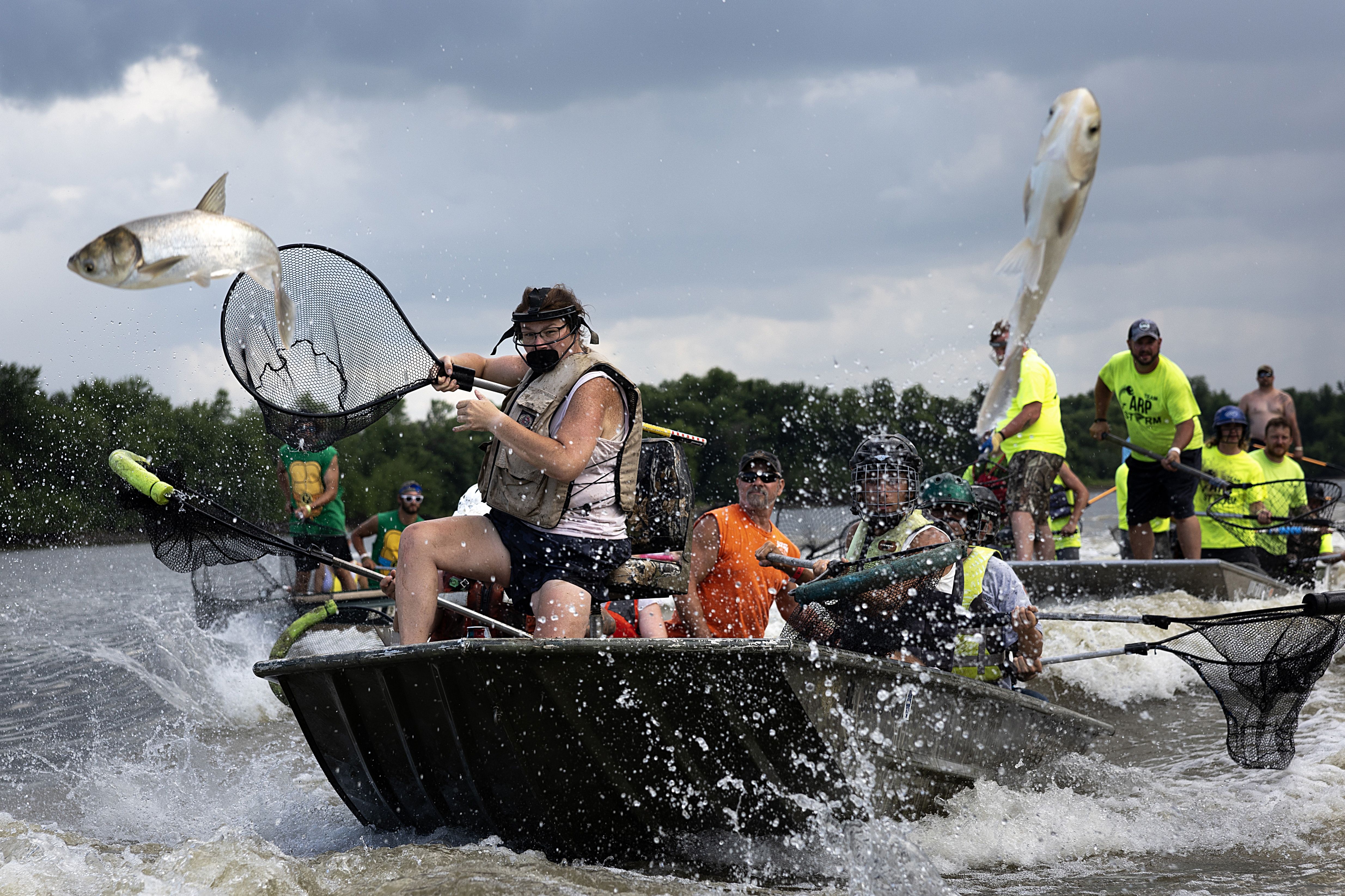 Participants attempt to catch Asian carp in nets as they compete in Betty DeFord's Original Redneck Fishin' Tournament in the Illinois River on August 03, 2024 in Bath, Illinois. The annual fishing tournament targets Asian carp (also known as copi or silver carp) which is an invasive species in the Illinois River that has been destructive to the natural ecosystem and hazardous to boaters because of the propensity of the fish to leap up to 10 feet out of the water when spooked by vibrations from boat motors. Participants in the tournament use only fish landing nets to try and catch the fish while they are airborne. Many tournament anglers wear helmets and other protective gear to help prevent injuries when they get struck by airborne fish during the contest. Proceeds from the tournament are used to help homeless veterans. The captured fish are processed into fertilizer. (Photo by Scott Olson/Getty Images)