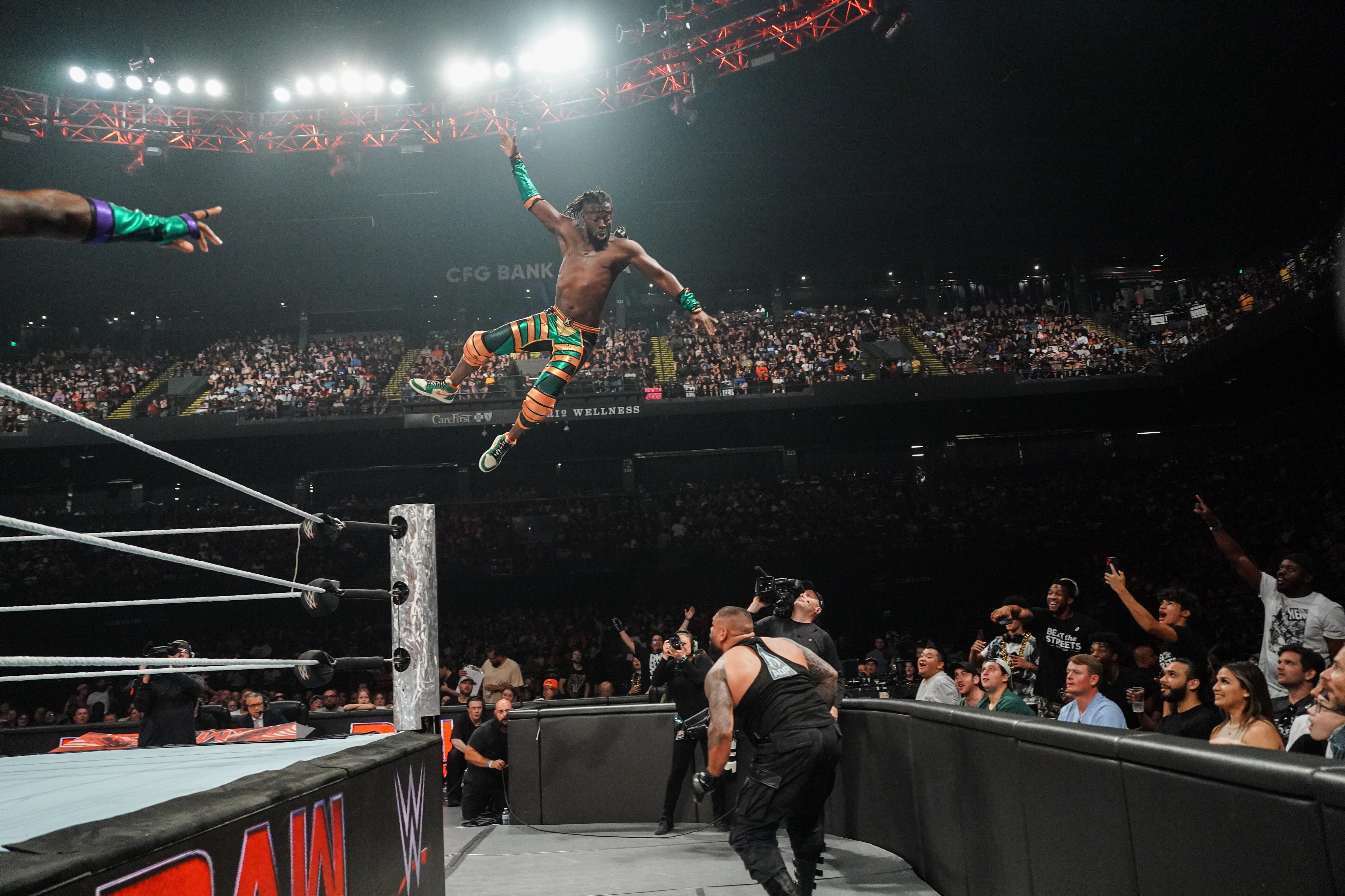 The wrestler Kofi Kingston in air against Akam during Monday Night RAW at CFG Bank Arena on August 5, 2024 in Baltimore, Maryland. (Photo by WWE/Getty Images)
