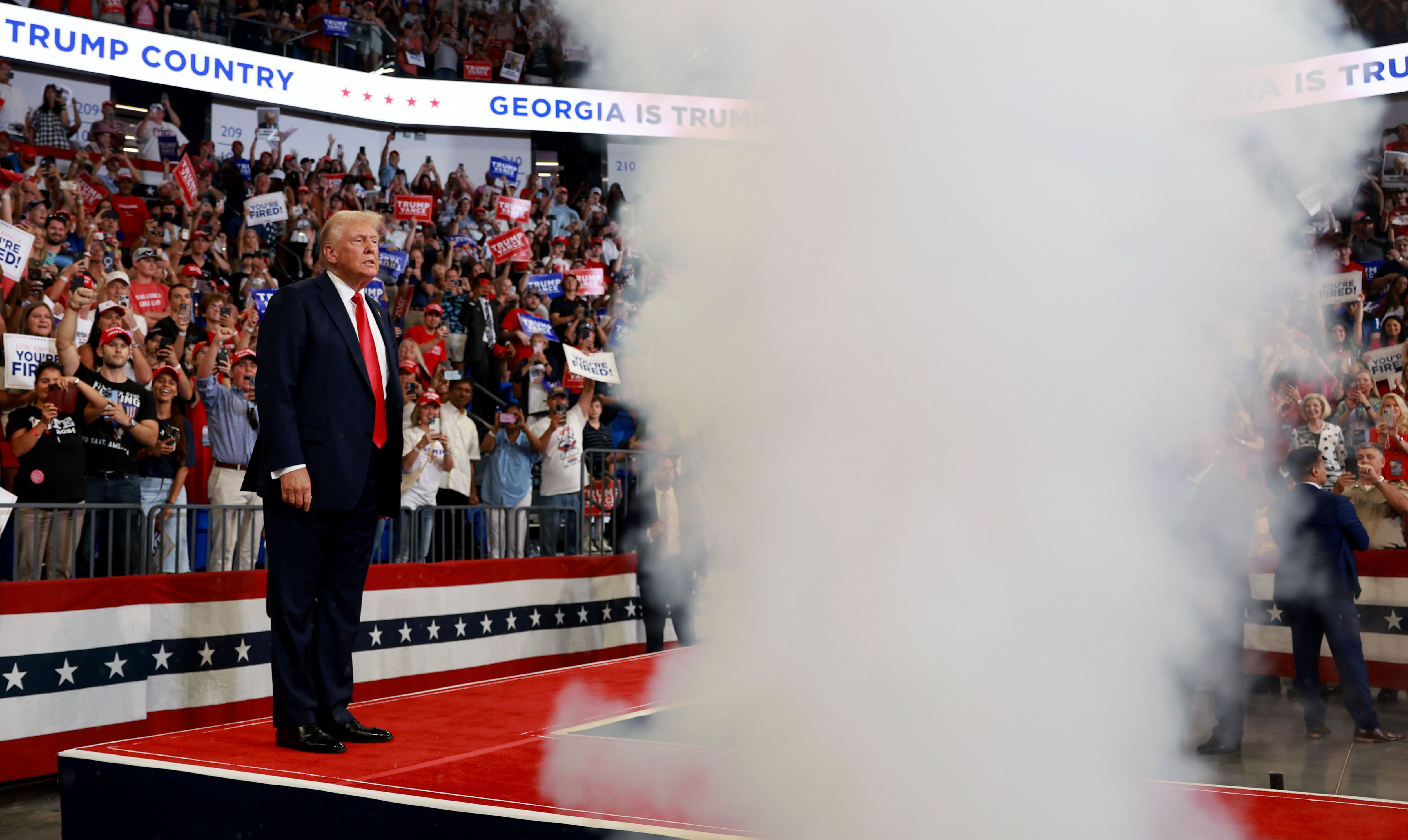 A smoke machine goes off as Republican presidential nominee, former U.S. President Donald Trump is introduced during a campaign rally at the Georgia State University Convocation Center on August 03, 2024 in Atlanta, Georgia. Polls currently show a close race between Trump and Democratic presidential candidate, U.S. Vice President Kamala Harris. (Photo by Joe Raedle/Getty Images)
