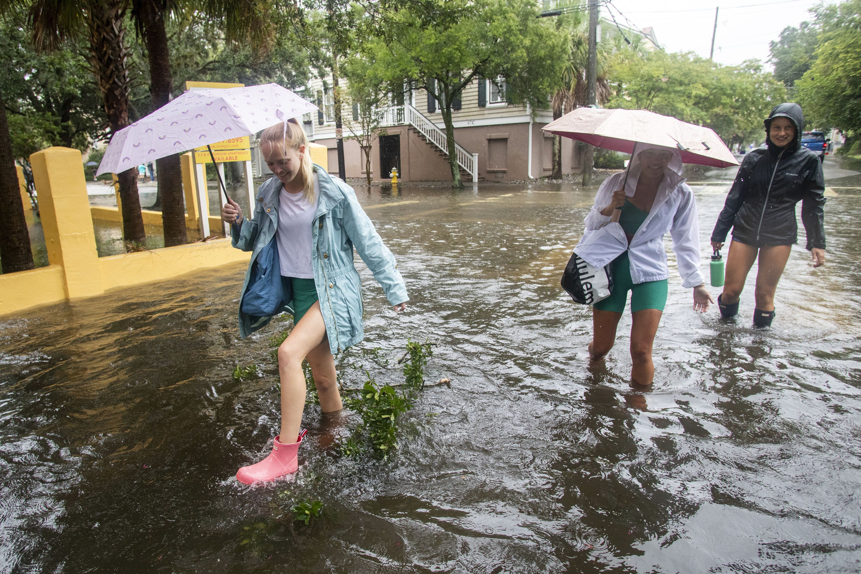 Pedestrians make their way down Montagu St. in Charleston, S.C., as Tropical Storm Debby approaches, Tuesday, August 6, 2024. (Photo by Mic Smith/AP Photo)